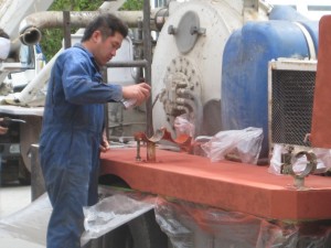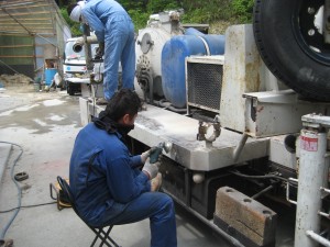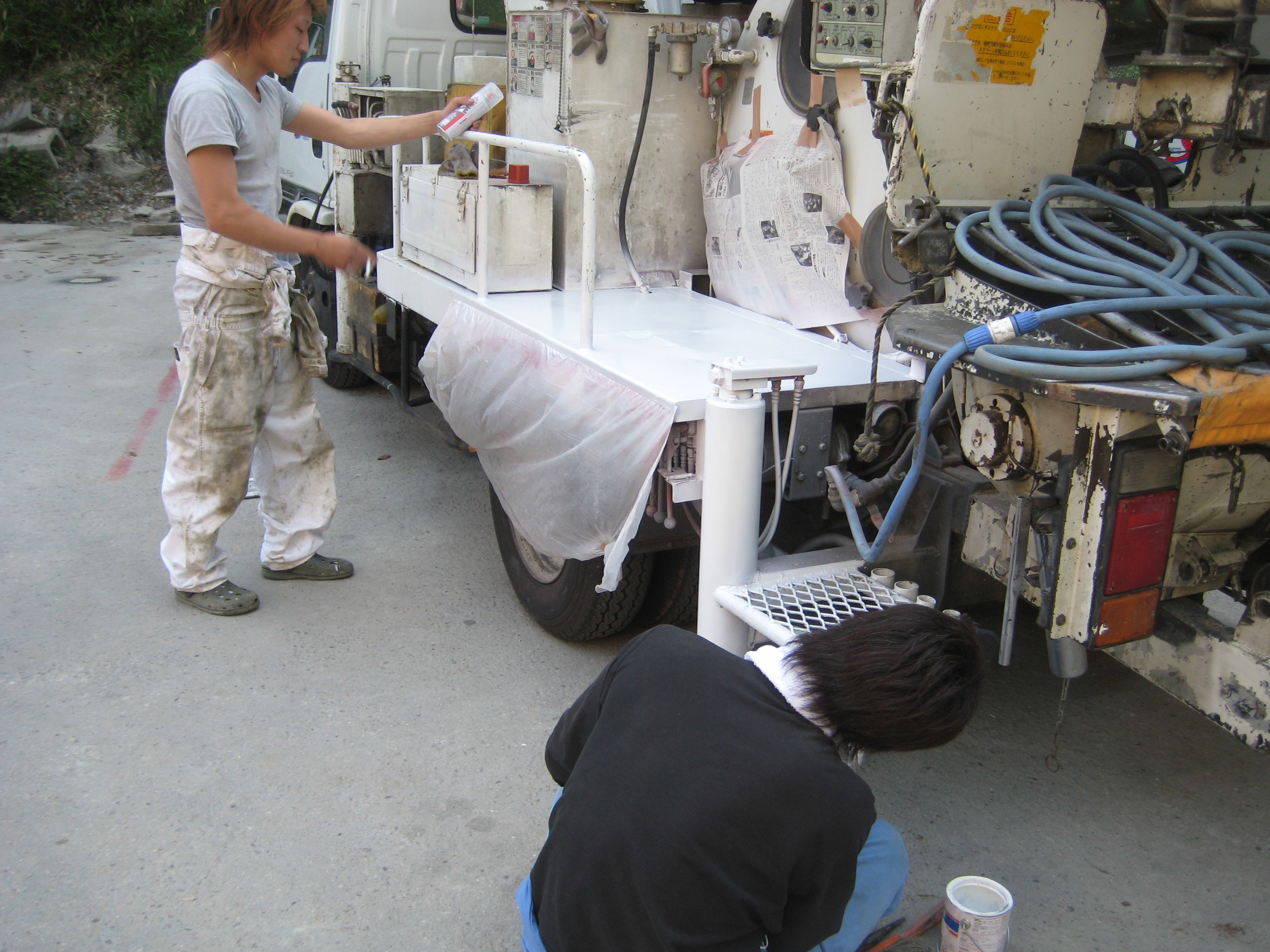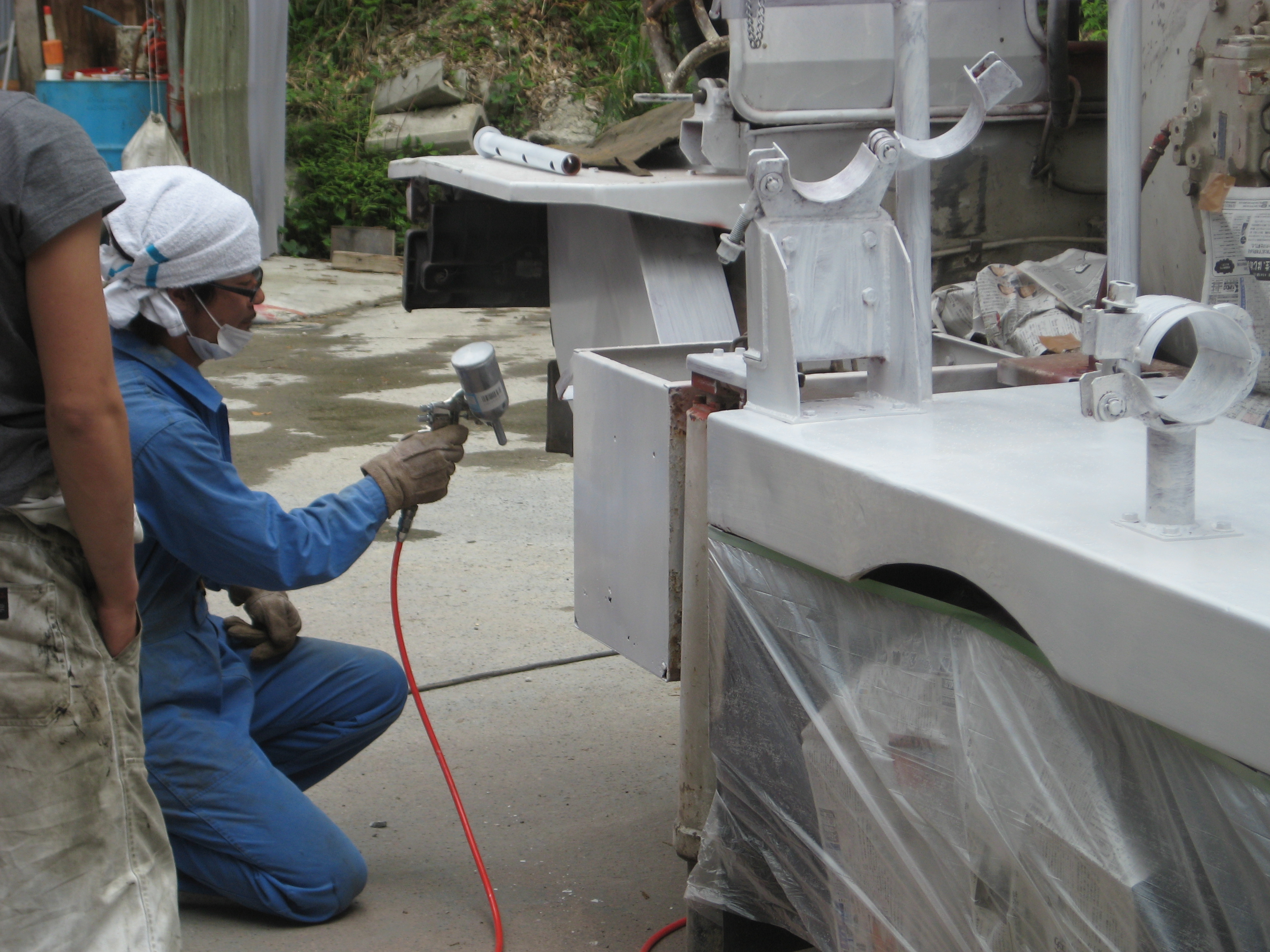 5月17日(火)から塗装開始 2011.05.23 先日、雨の日に道具箱を塗装したら思いのほかキレイになったので、 ボディ部分の塗装をしみようと思いグラインダーで削っています 養生テープをして下地に サビ止めをスプレーしているのが 主任の三谷です。 キレイに塗れているか心配(笑) スプレーガンで仕上げをしているのは、志築です。 キレイに仕上がりました。 が この後2時間後雨が降ってきました(泣)