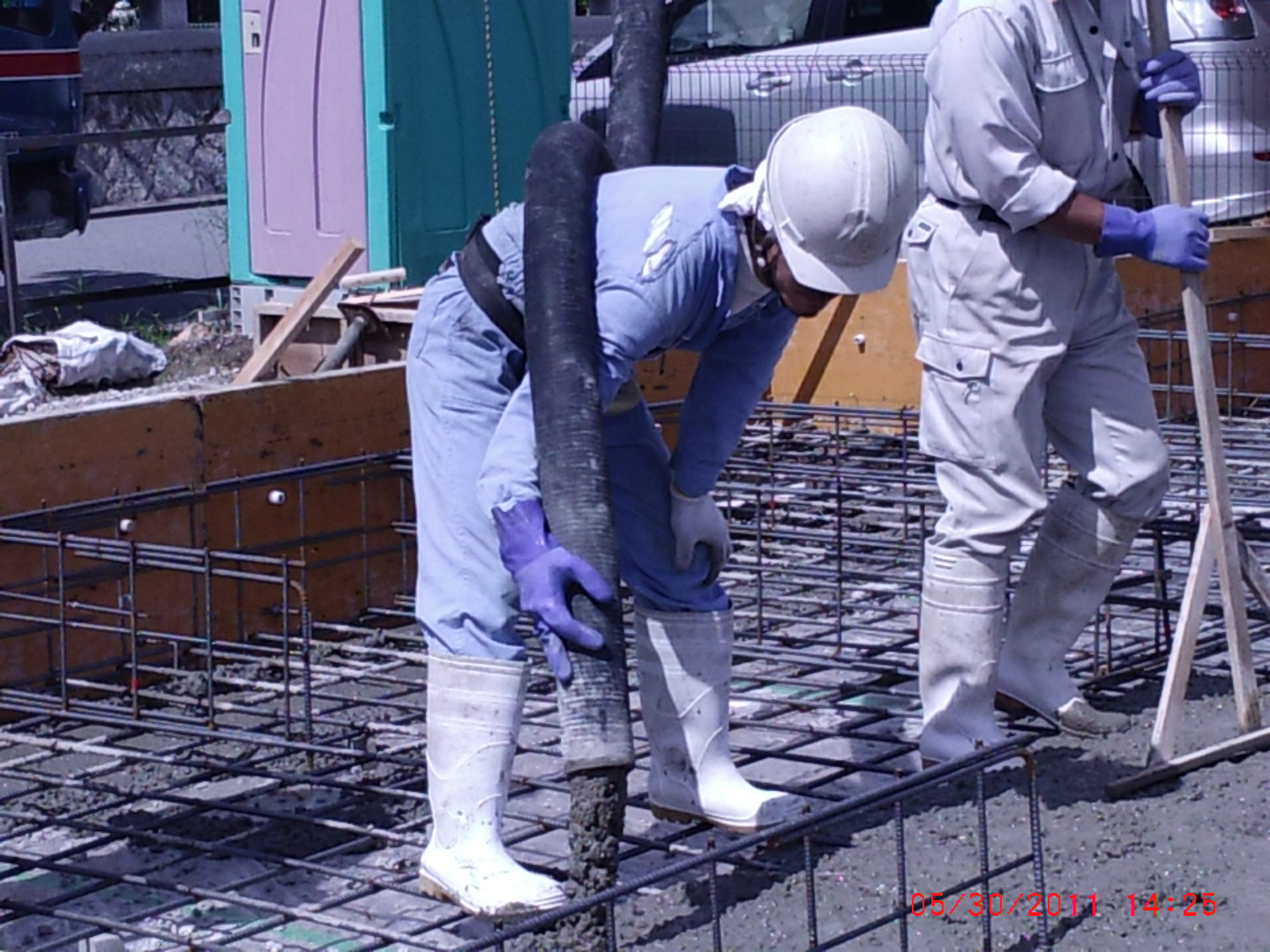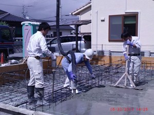 圧送中 (住宅基礎打設) 2011.06.03 最近雨が多いので 久しぶりに天気のいい日に仕事が出来ました。 住宅基礎工事のベース部分を打設しています。 生コンの飛散を少なくする為に、中腰で抱えてホースの先端部分を出来るだけ下方にします。 現場が汚れない様に細心の注意を払っての作業を心がけています。 😀