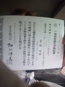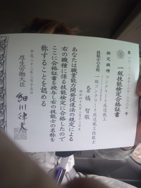 一級技能検定合格 2011.07.10 お初ですこんにちわ 従業員の橘です。 え~今年やっとコンクリート圧送施工一級技能検定に2回目の挑戦で 合格しました これでやっと一人前? 暑い日が続くけどみなさん水分しっかりとって頑張ってくださいね。