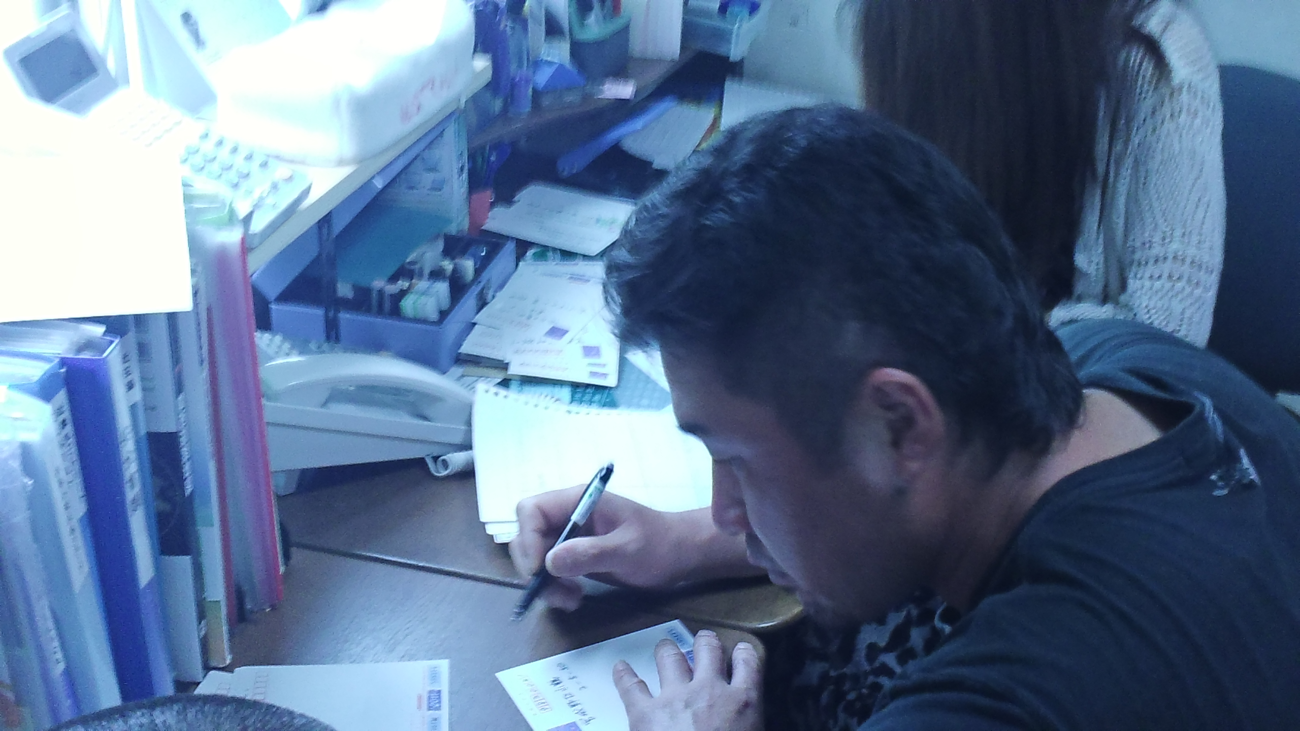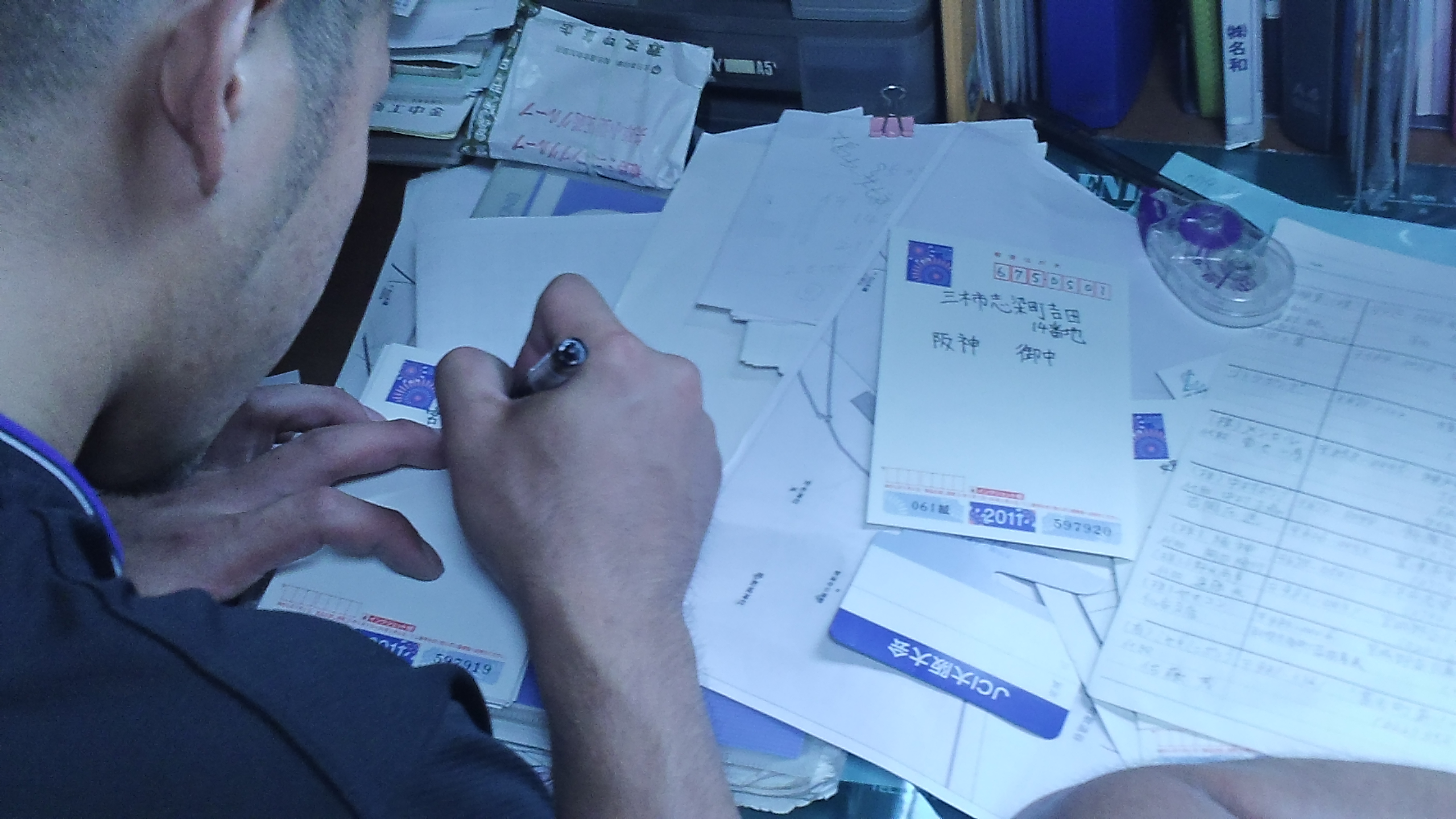暑中お見舞い申し上げます! 2011.07.20 こんにちは、杉本です。 ある日の事務所の風景です。 新人の福田 主任の三谷 二人が社内で字がきれいな方なので暑中見舞いの宛名書きを しています。 二人ともごつい太い腕しながら小さいペンを持って事務の彦坂の お手伝い(笑)