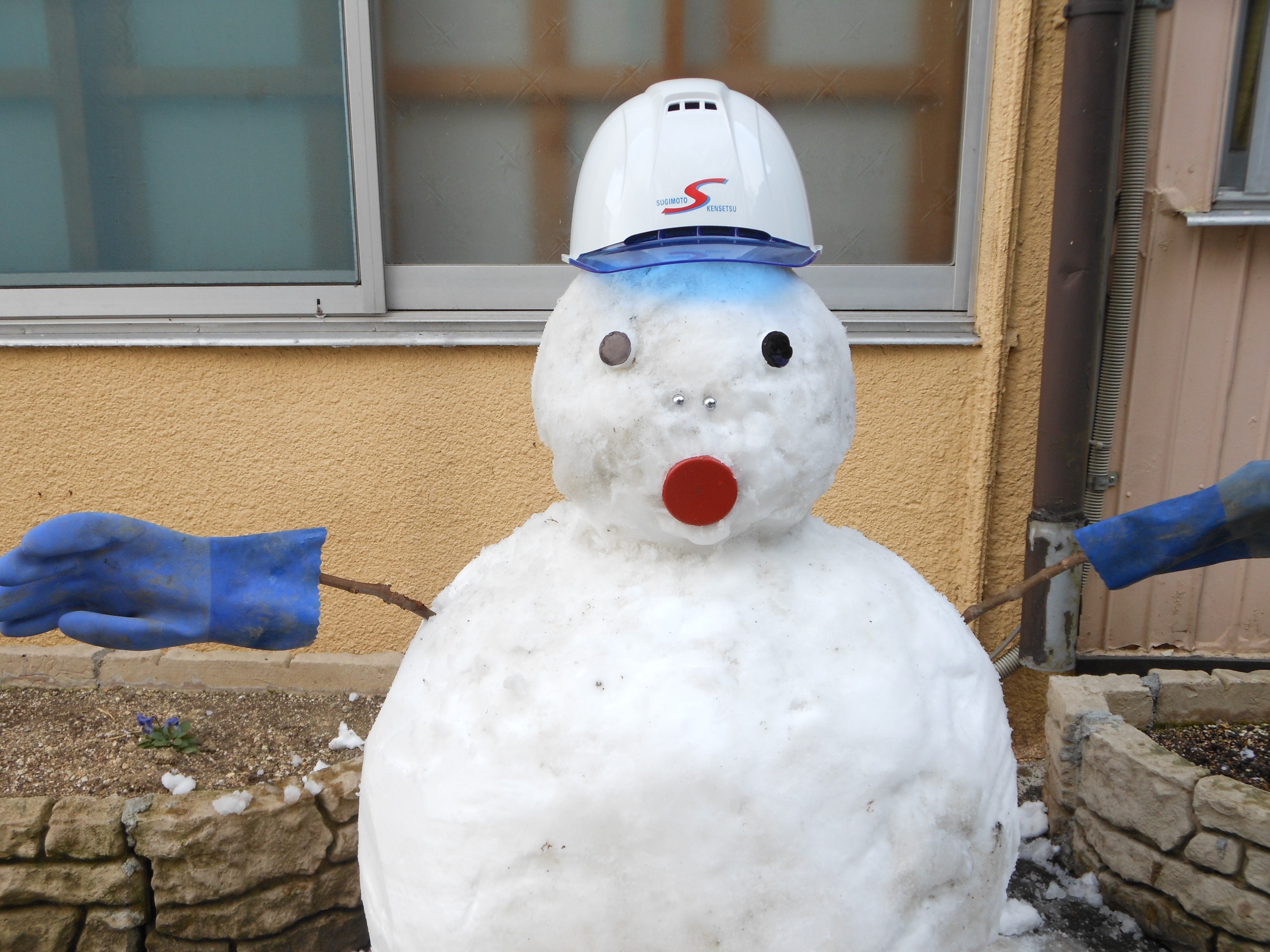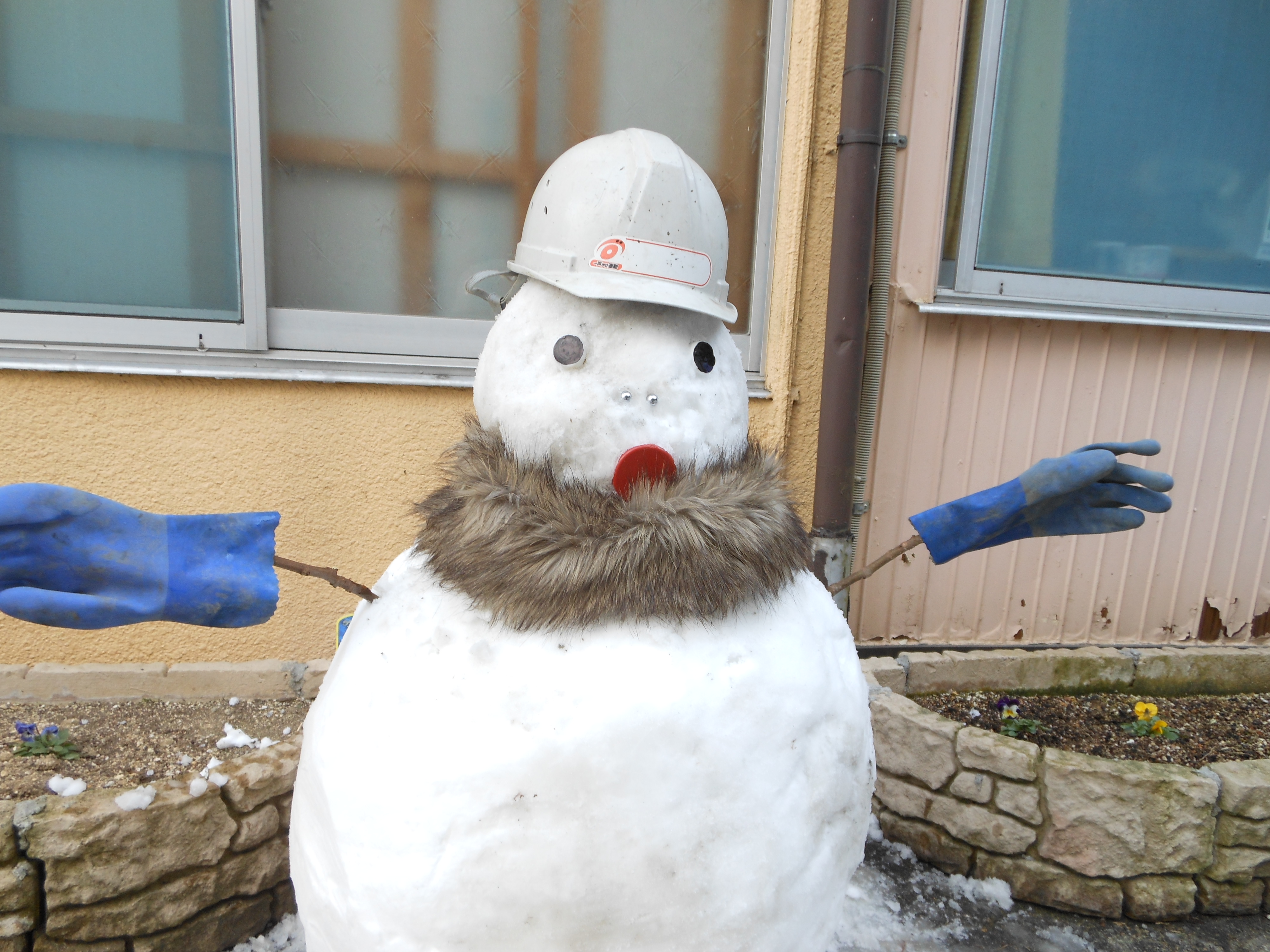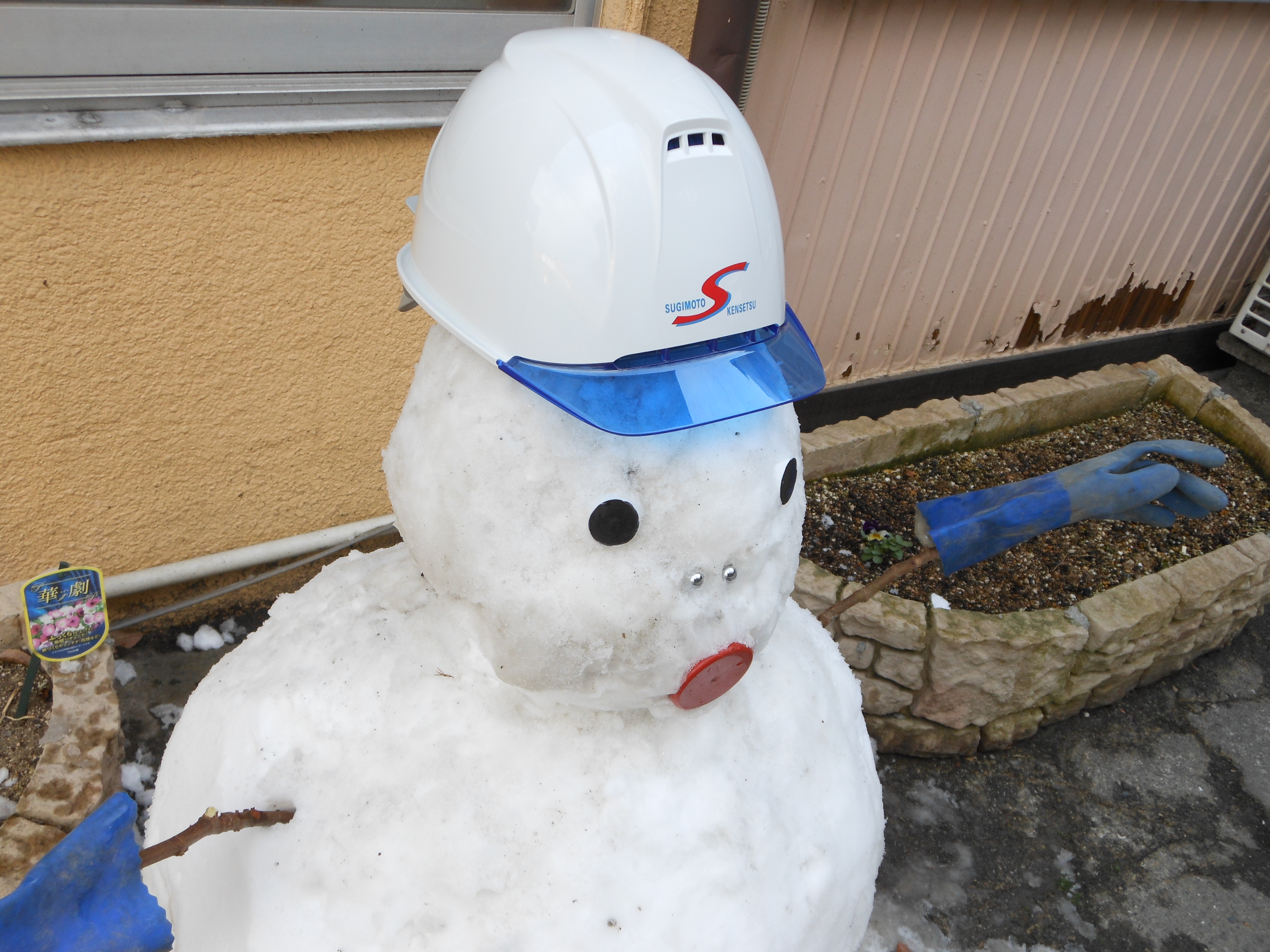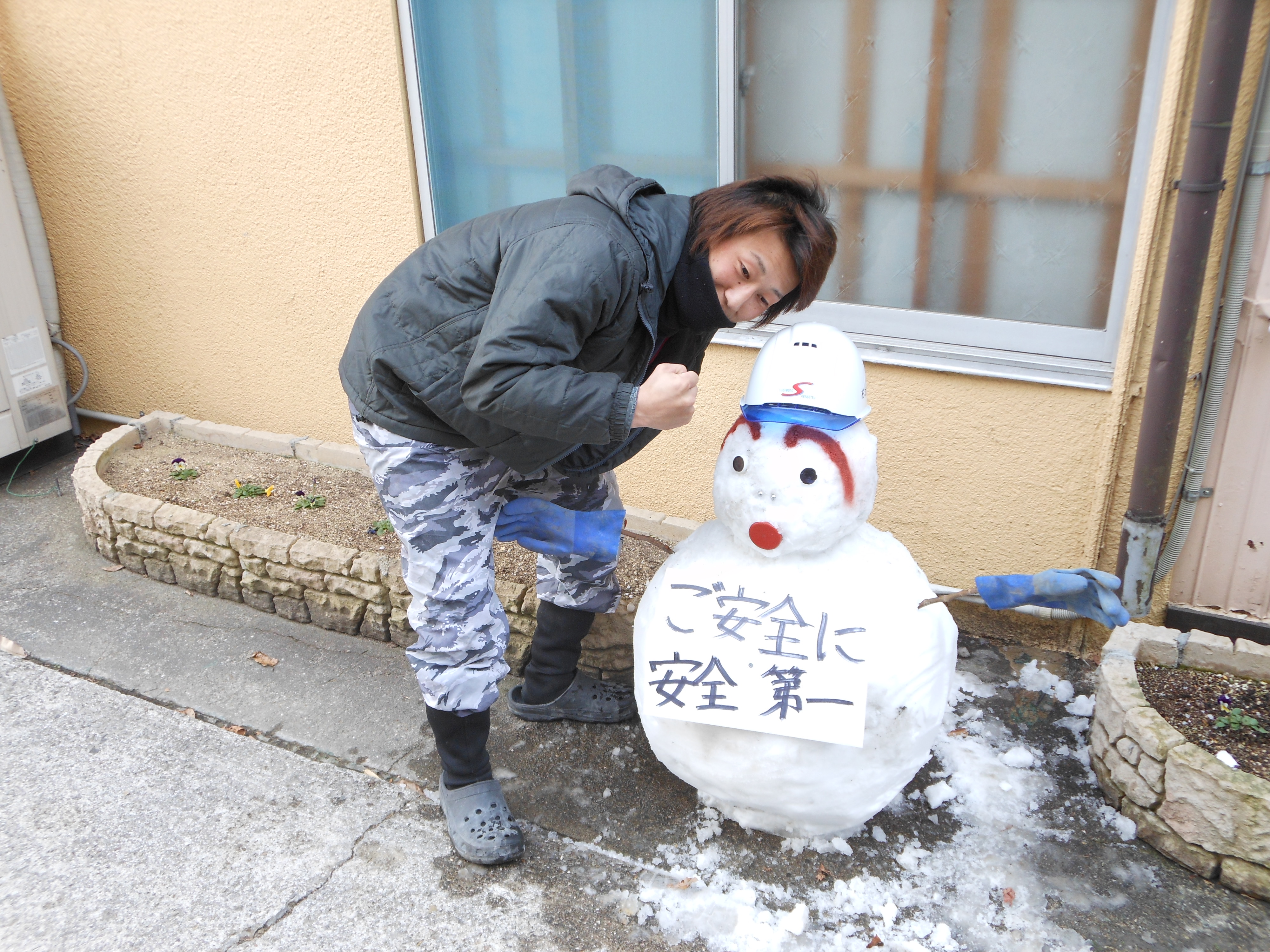 作業風景! 2012.02.09 こんにちは、杉本です。 先ほどブログに米谷(こめたに)くんが投稿した雪ダルマの制作風景をお伝えします! 雪ダルマの口を付けてるのが福田くんです! 今日は、米谷・福田ペアで朝の6時にガレージを出発して豊岡の現場に行ってました。 あまりの雪の多さを伝えたくて大量の雪をポンプ車に積んで持って帰って来てくれました。 事務の彦坂(通称 なおちゃん)さんが 楽しそうに雪ダルマに自分のマフラーを着けてました。 それを見ていた私がヘルメットを新調して段々と完成に近づいてきました!! 最後に米谷くんがまゆ毛を描いて完成!! それでは、みなさんご安全に!!