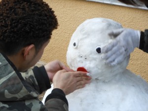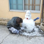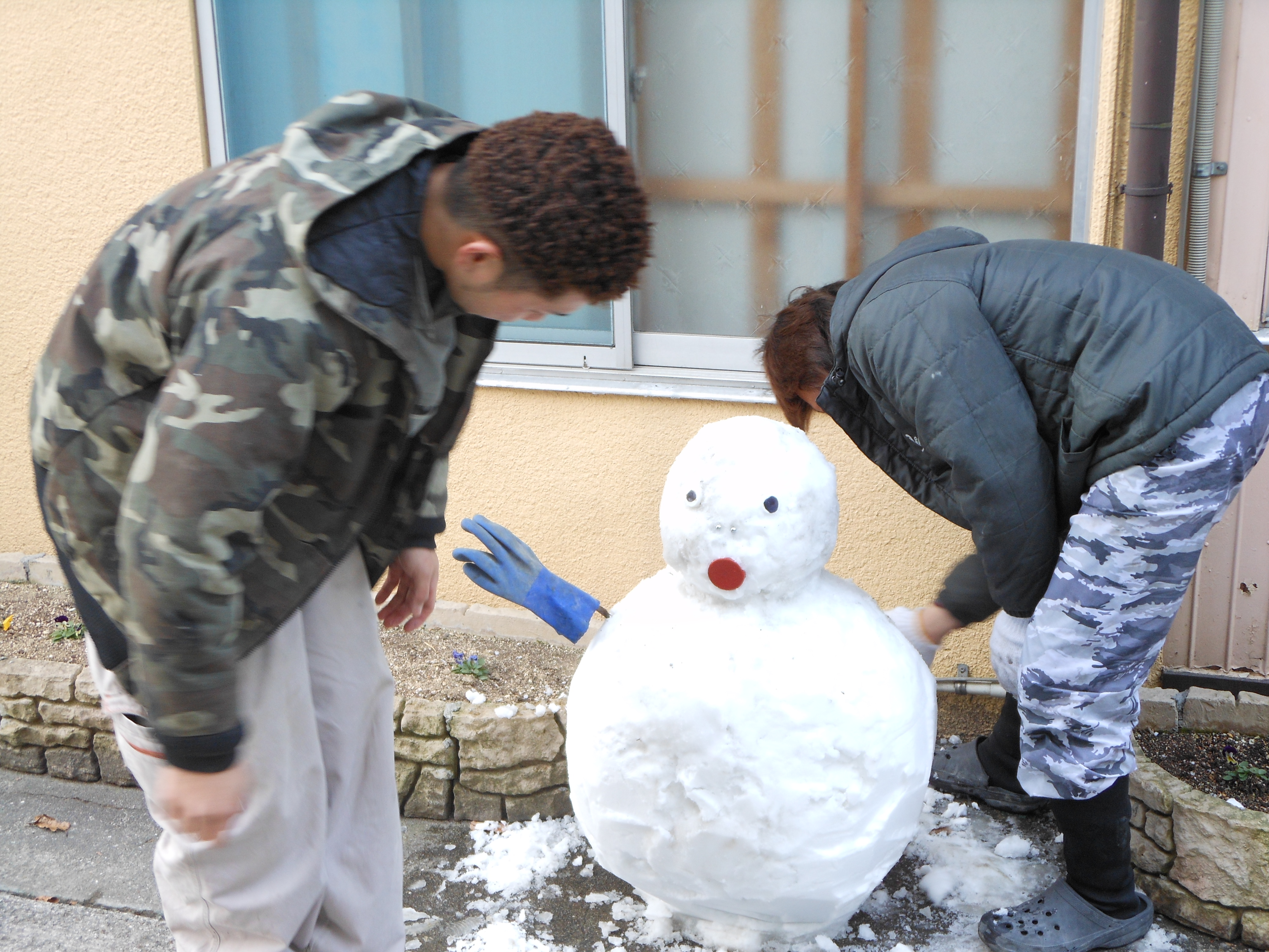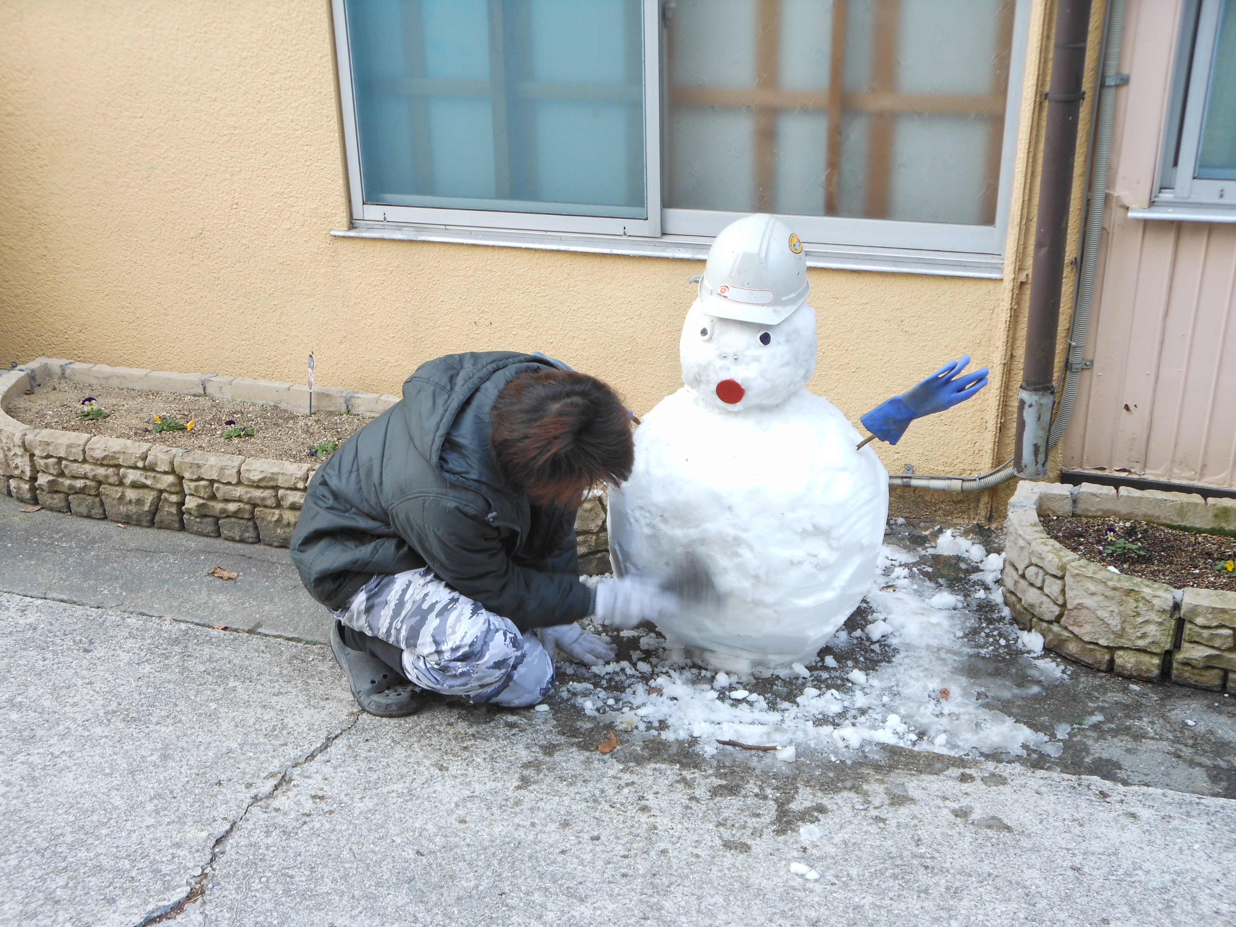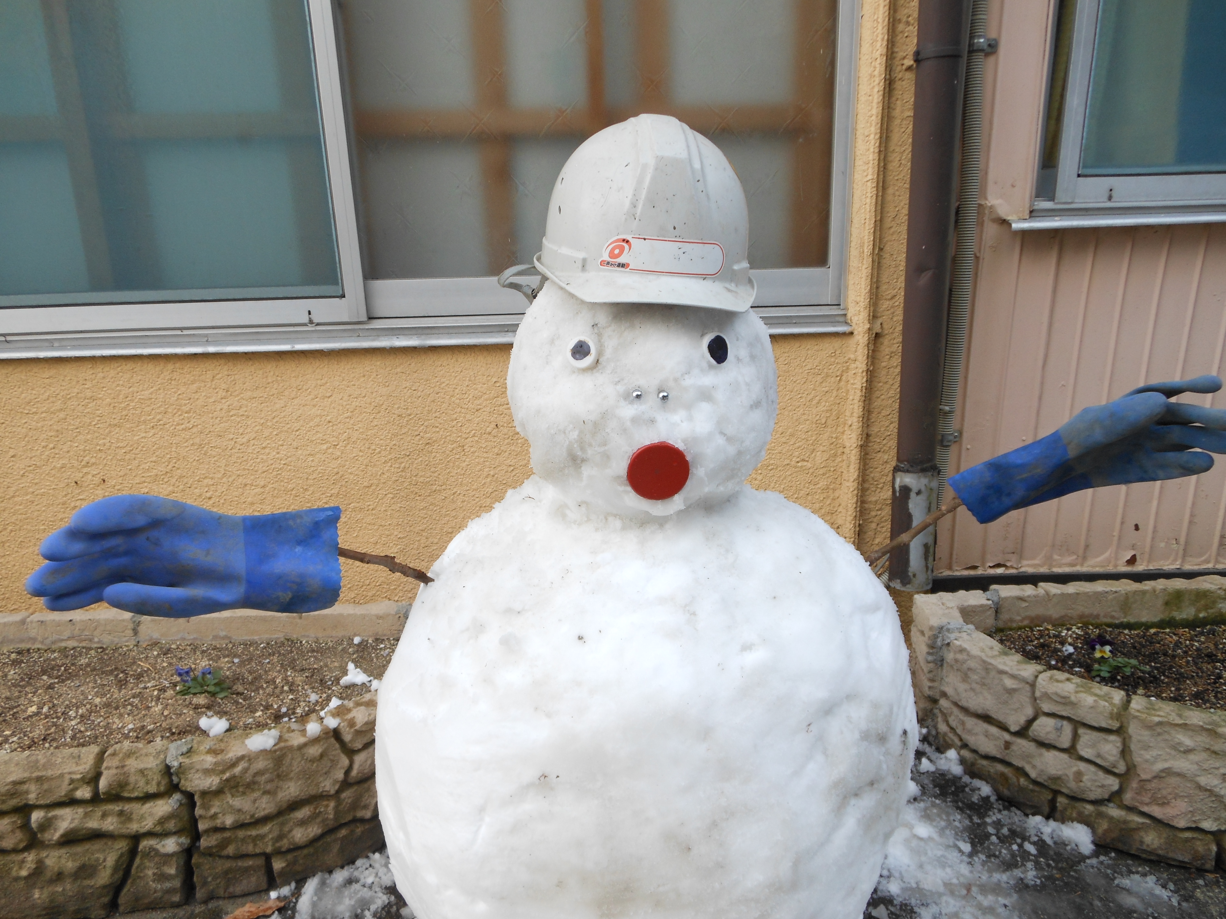 作業風景! 2012.02.09 こんにちは、杉本です。 先ほどブログに米谷(こめたに)くんが投稿した雪ダルマの制作風景をお伝えします! 雪ダルマの口を付けてるのが福田くんです! 今日は、米谷・福田ペアで朝の6時にガレージを出発して豊岡の現場に行ってました。 あまりの雪の多さを伝えたくて大量の雪をポンプ車に積んで持って帰って来てくれました。 事務の彦坂(通称 なおちゃん)さんが 楽しそうに雪ダルマに自分のマフラーを着けてました。 それを見ていた私がヘルメットを新調して段々と完成に近づいてきました!! 最後に米谷くんがまゆ毛を描いて完成!! それでは、みなさんご安全に!!