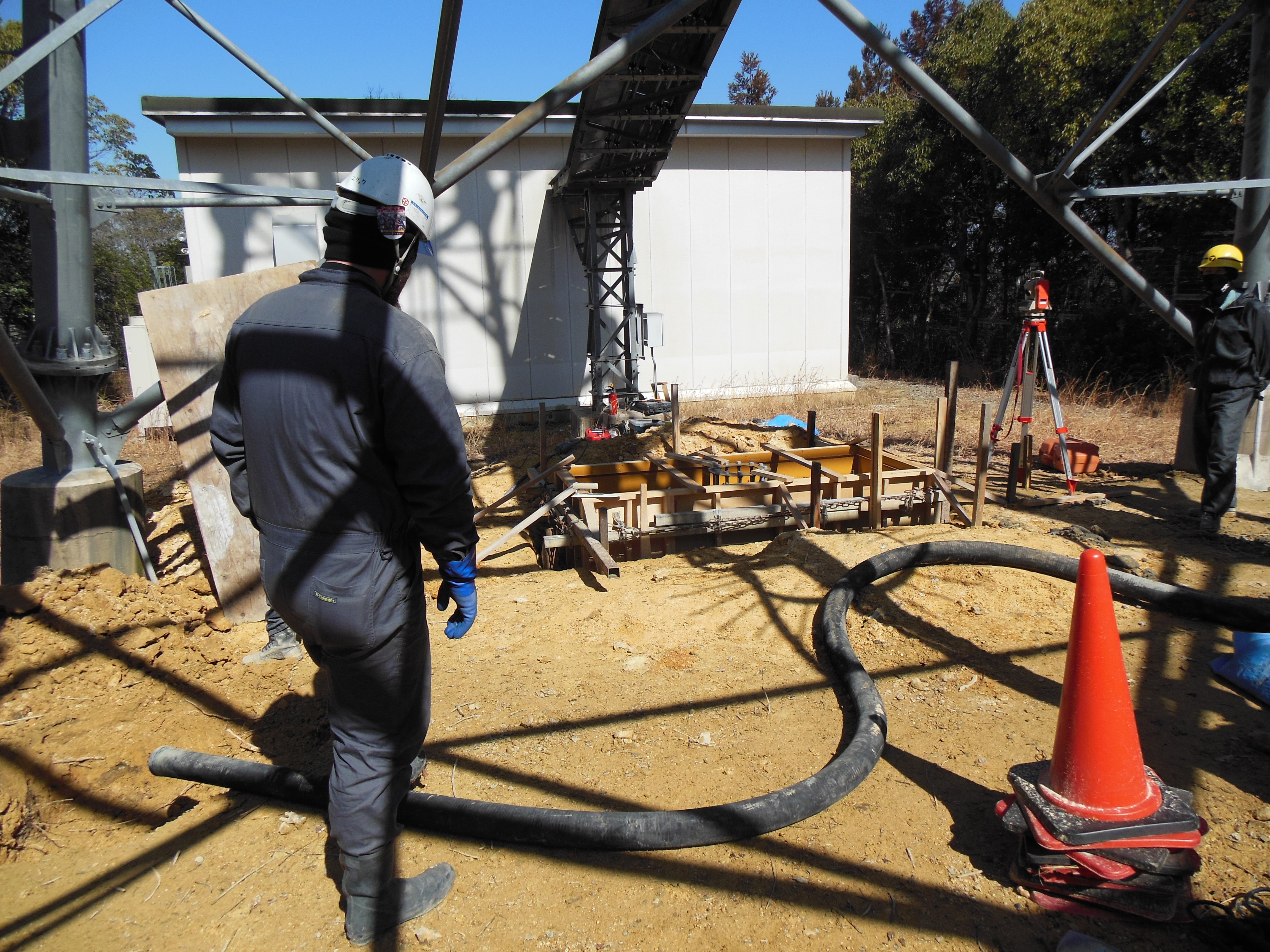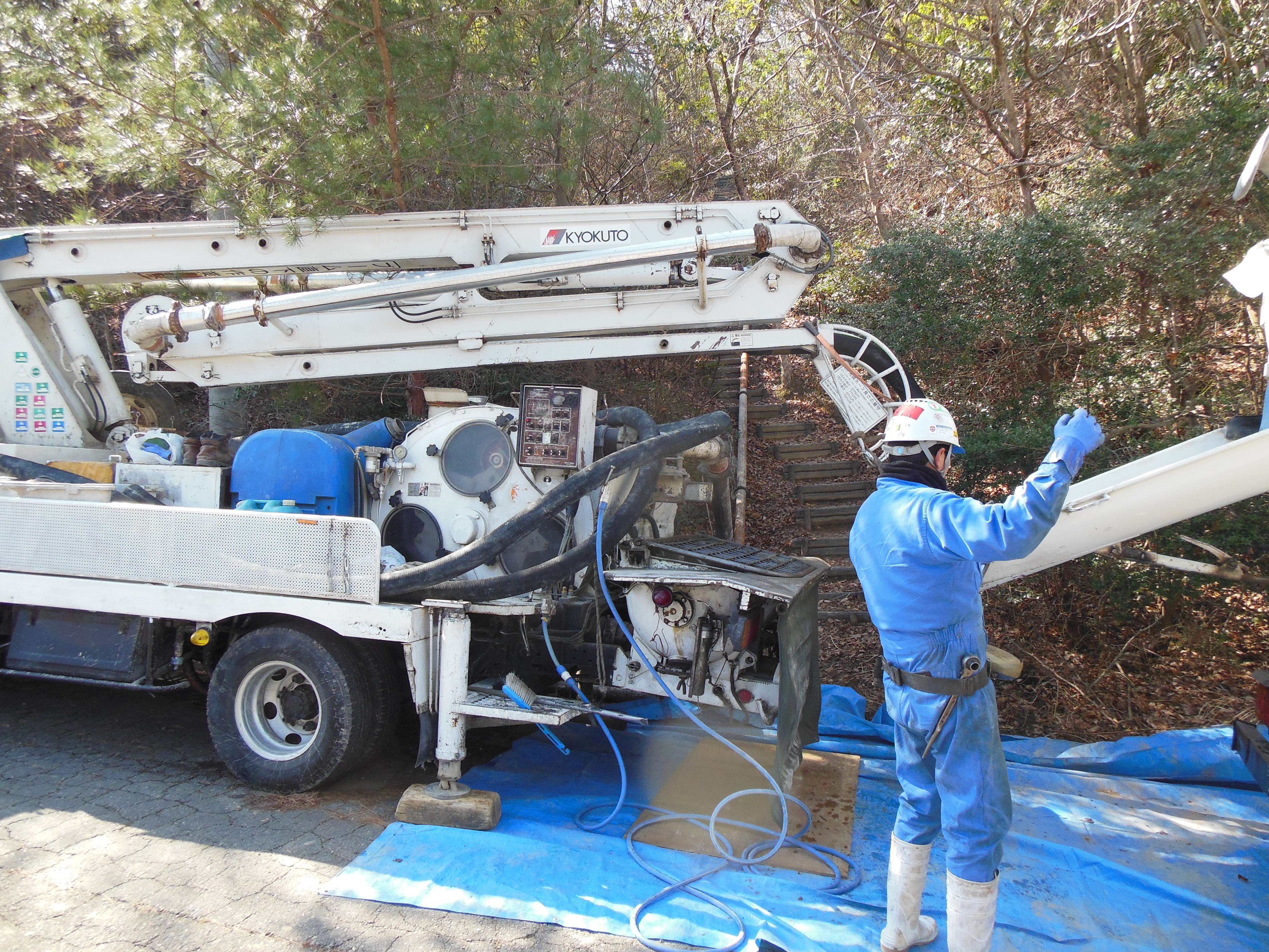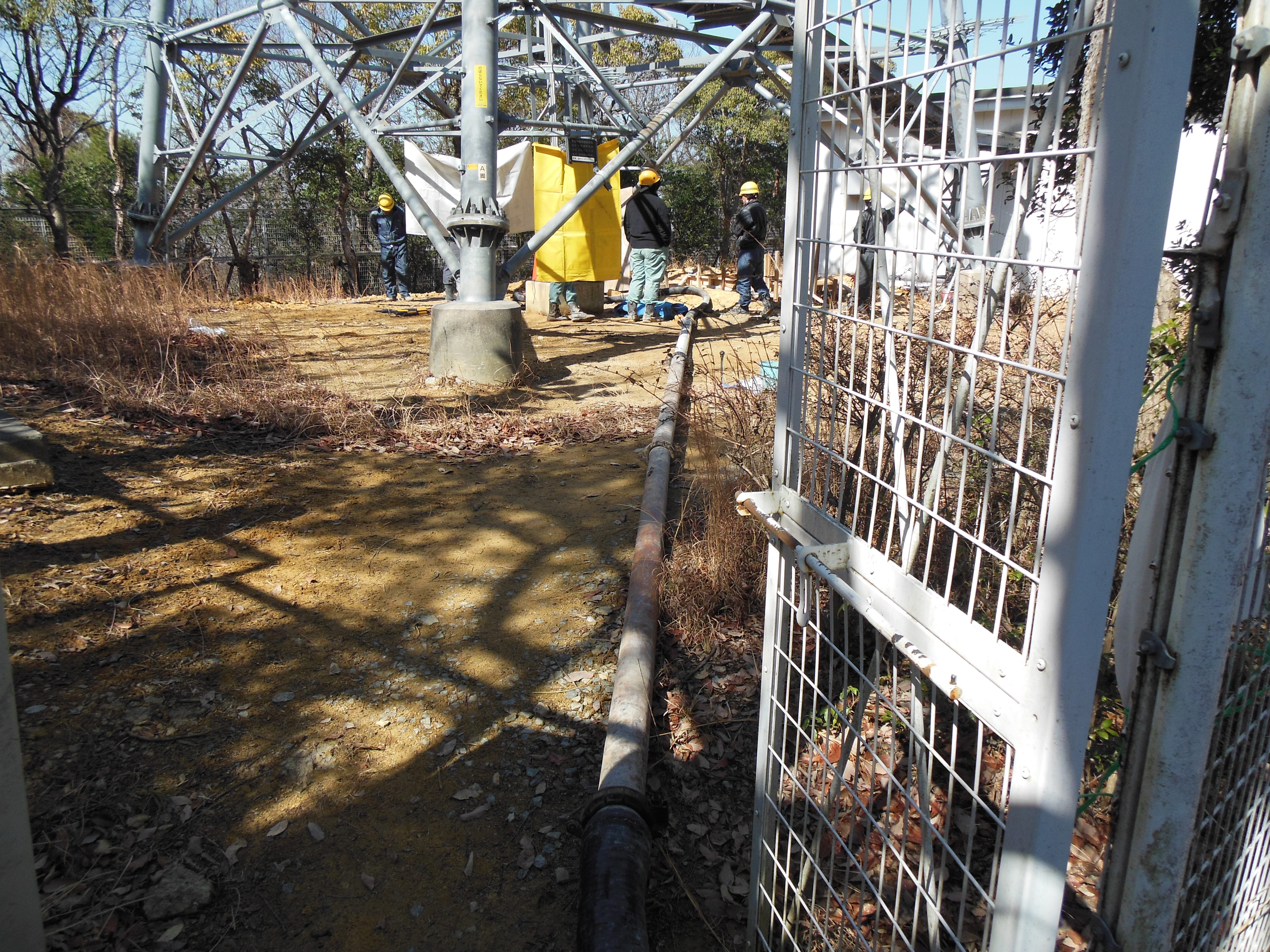 朝の現場で鉄塔の基礎打ちで4で生コン圧送作業はすぐに終わってましたがお片付けが