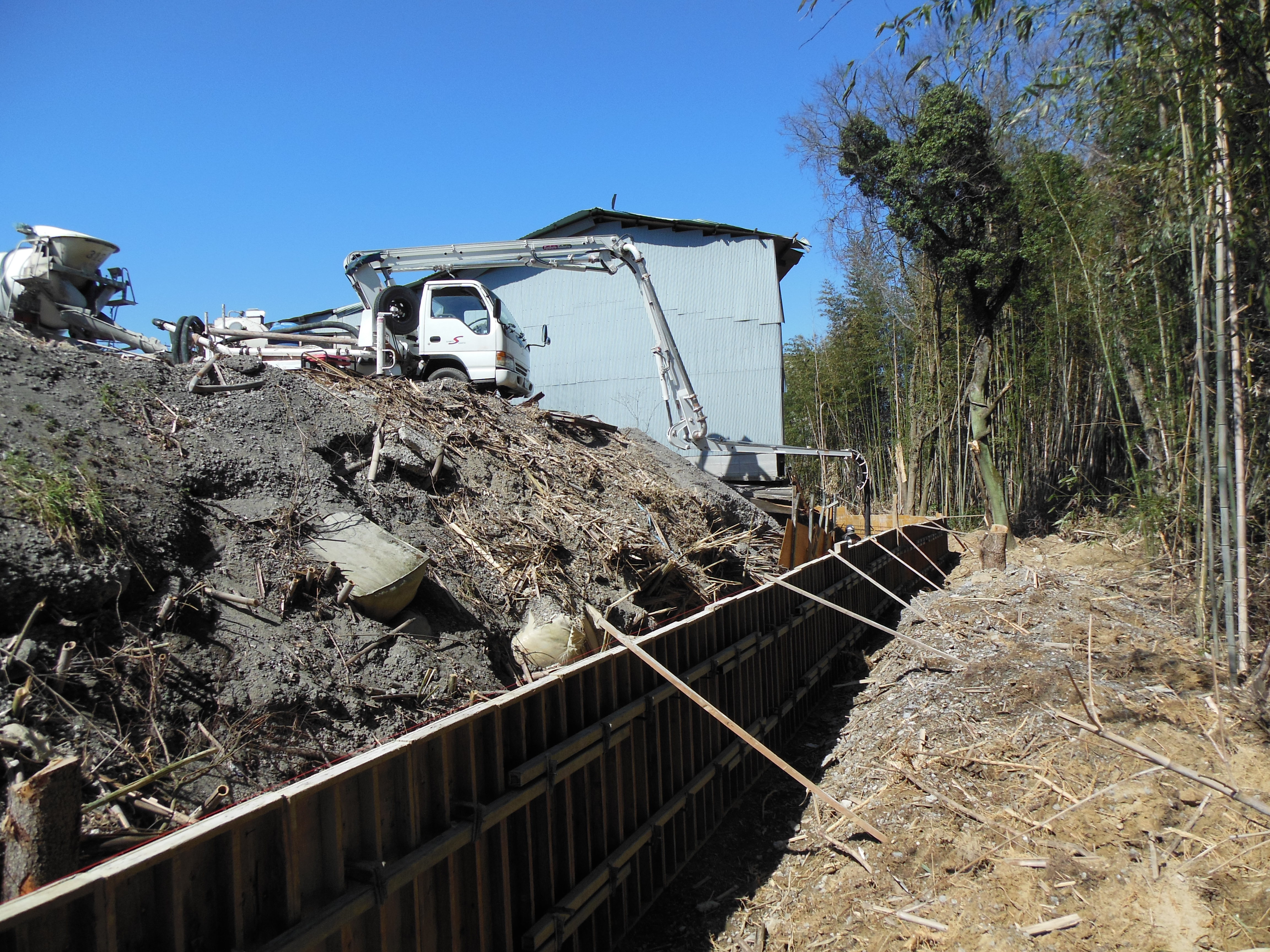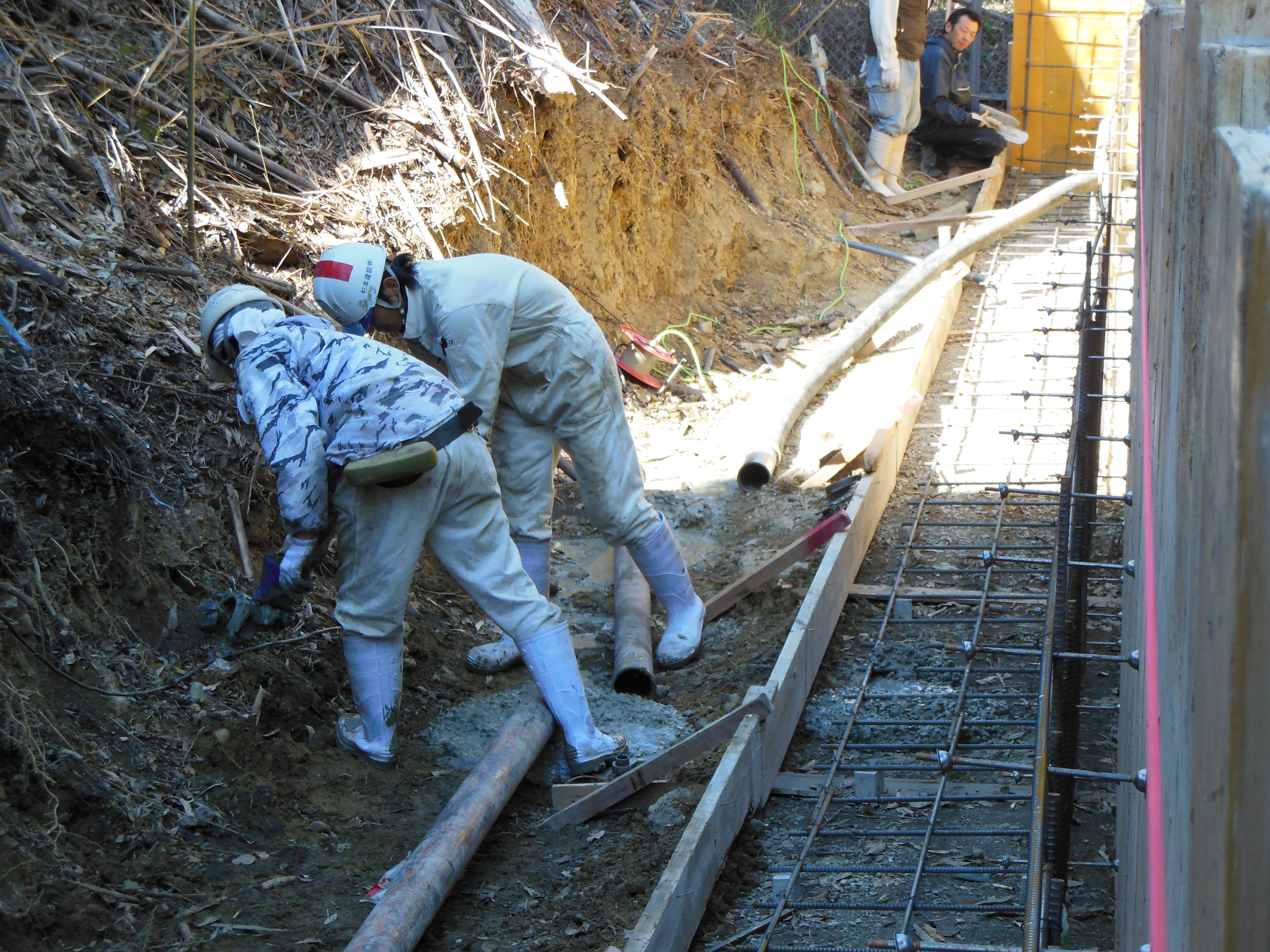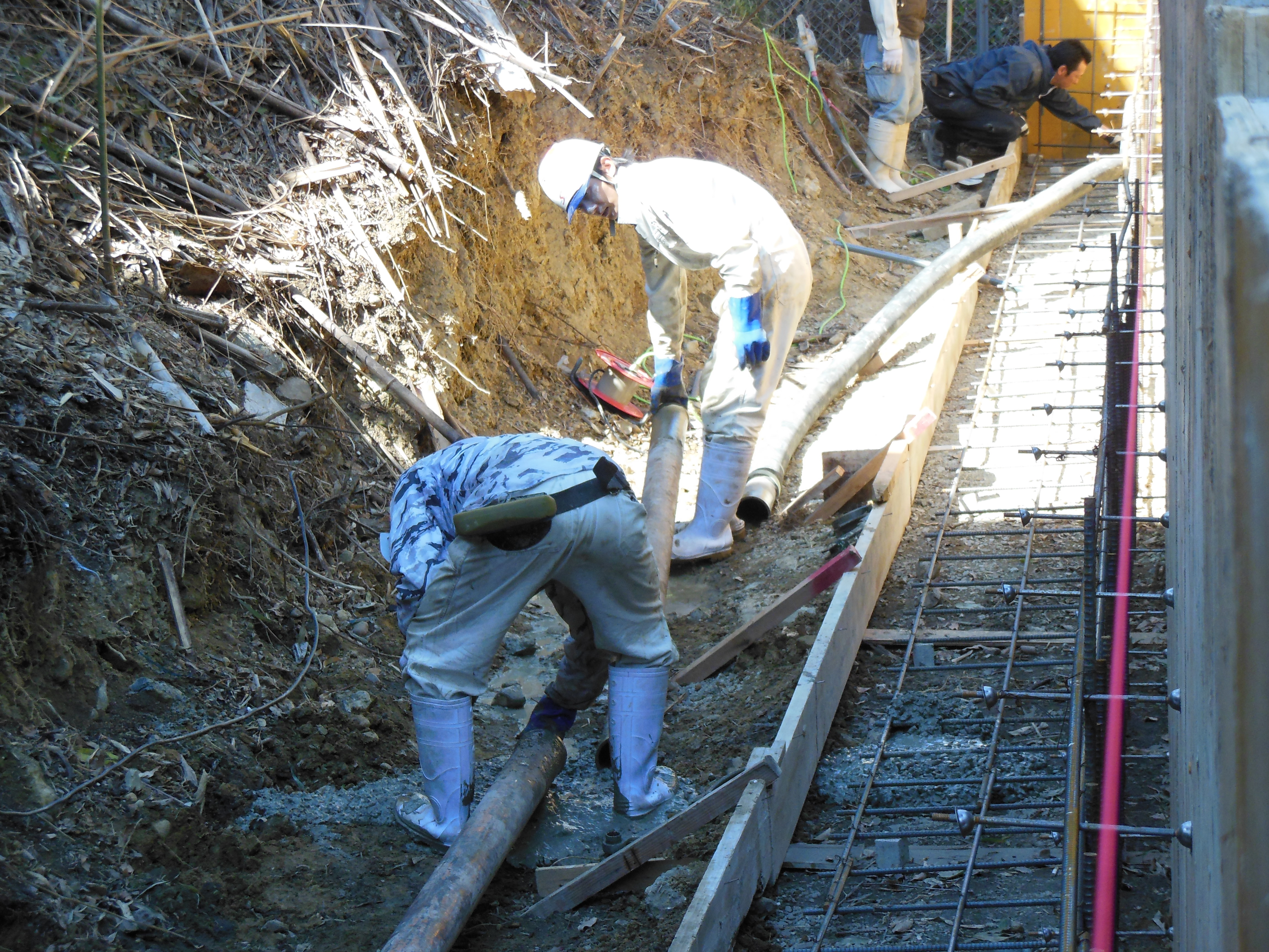 続いて昼からは、配管40メートルの擁壁のベースの打設風景です。