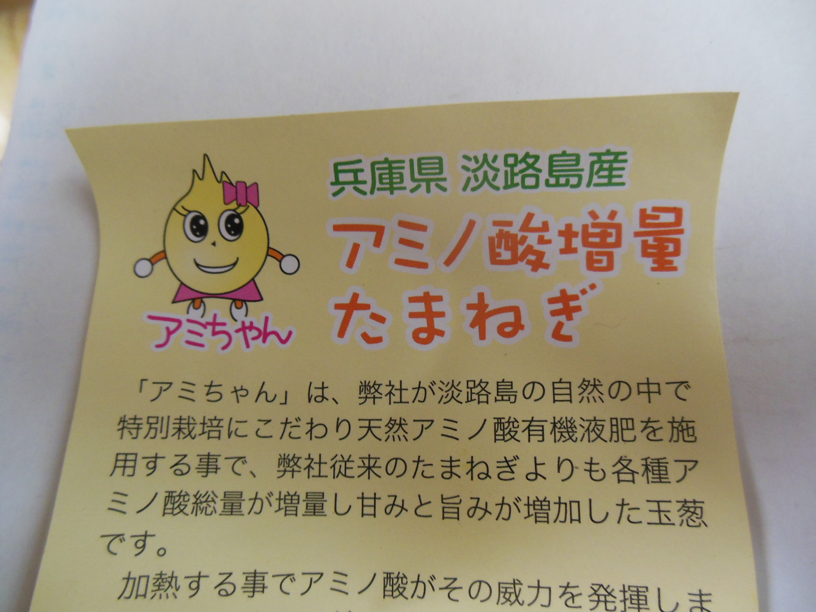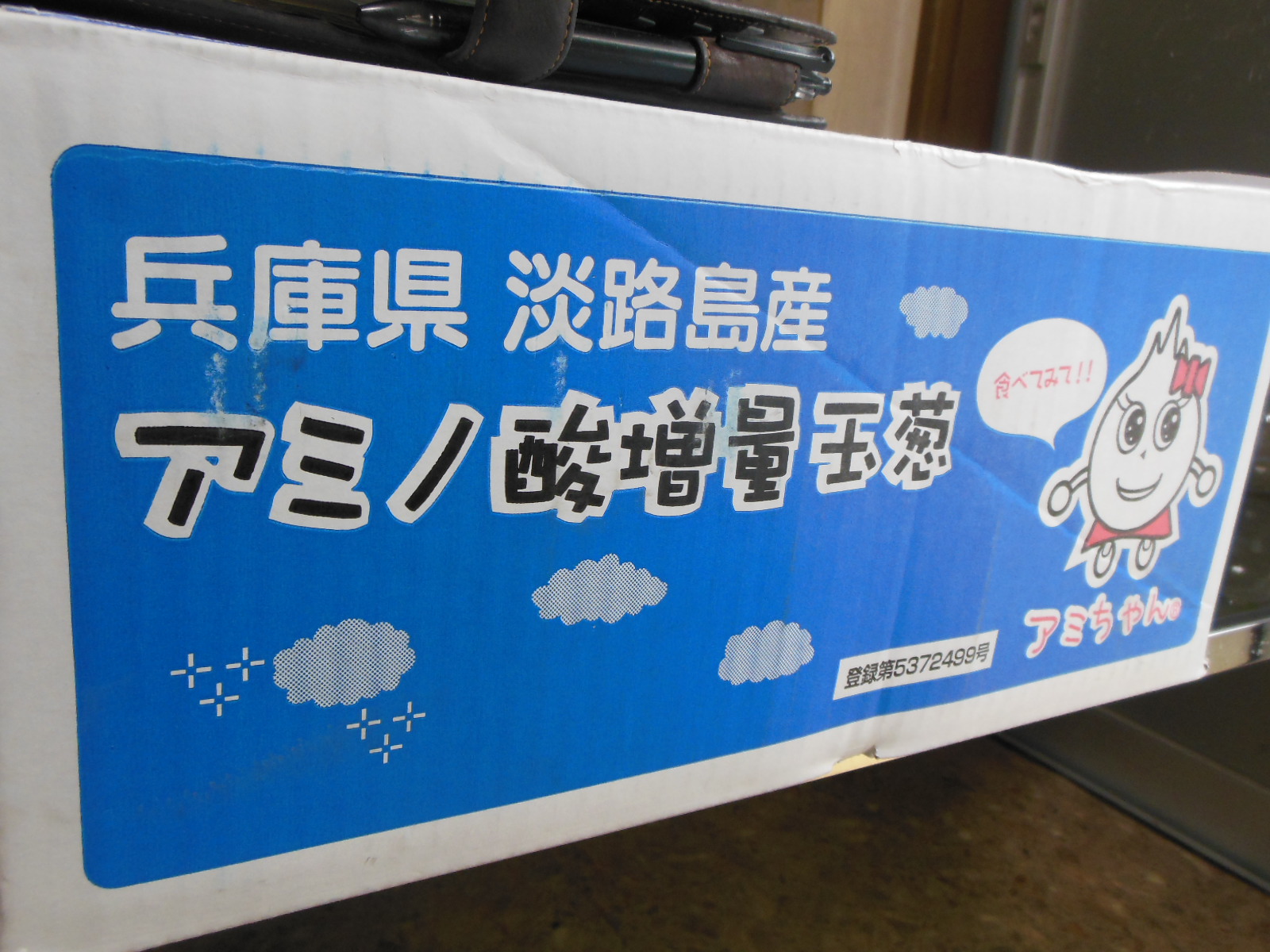 新たまねぎ 淡路島産!! 2014.05.22 こんにちは、杉本です! 淡路島から新たまねぎが届きました!! 淡路コンクリート圧送の社長さんからの送り物です!! 「アミノ酸増量玉葱」アミちゃん(笑) かわいい!! お礼のメールをすると「新たまねぎなんでナマで食べると美味しいよ」と!! 私から「事務所に戻ったらかぶりついてみます」とのメールの返信が 「目から涙が出たらハズレですわ!」でしたがナマで食べても美味しかったです!! 全員で分けていただきます!! 社長!!この玉葱は「アタリ」でした!! ありがとうございます!!