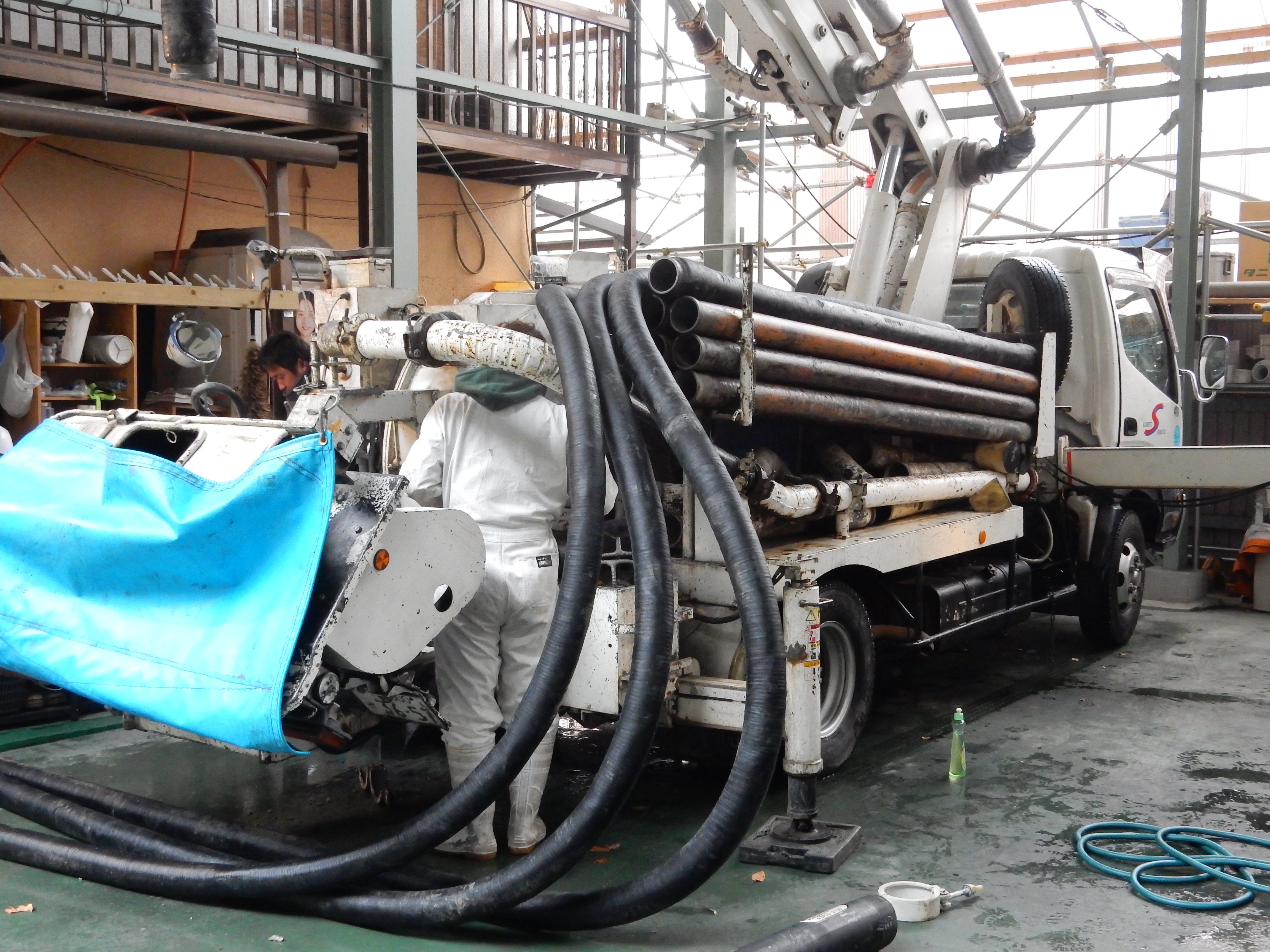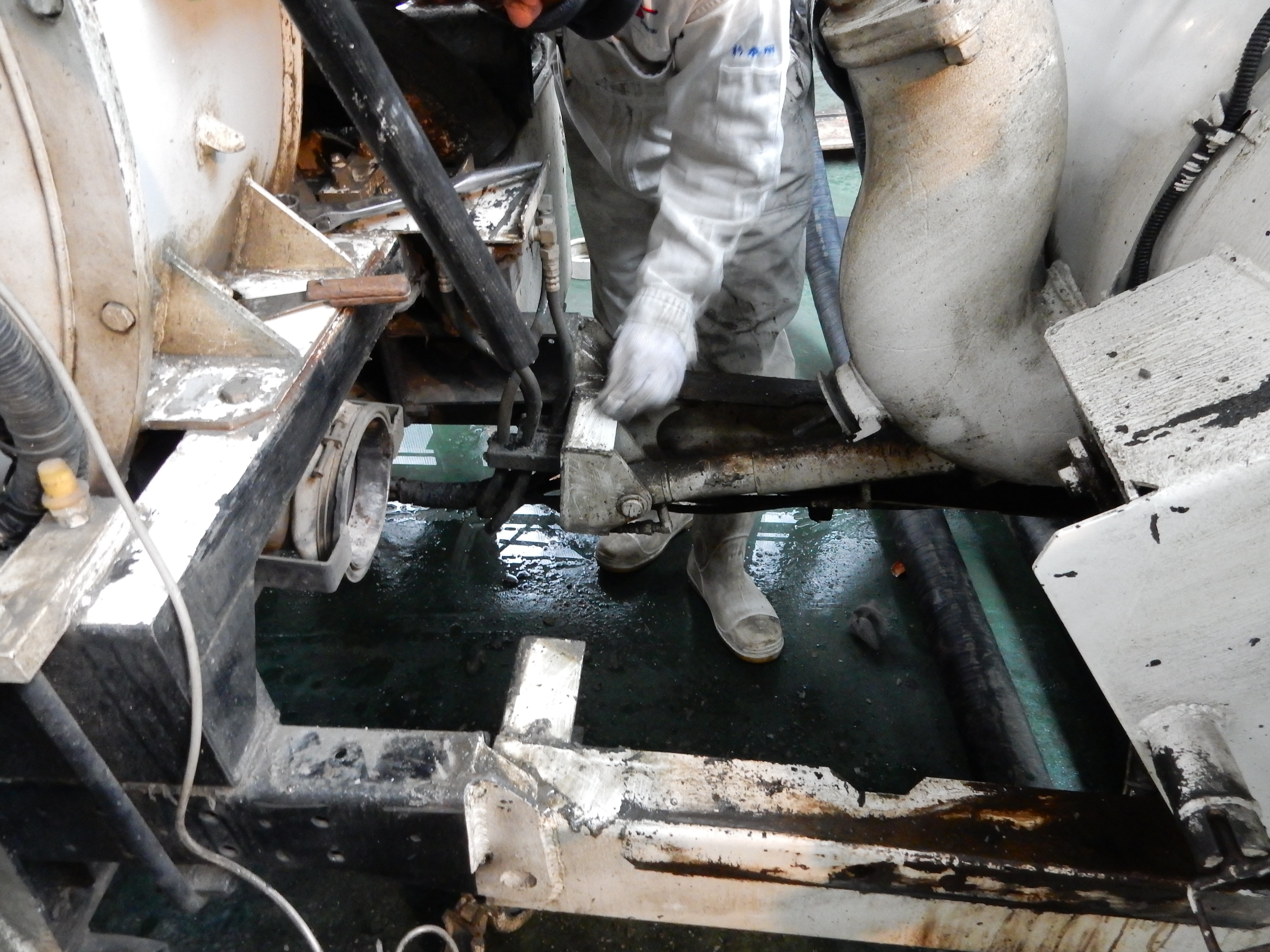 雨~♪の日の作業! 2014.12.11 こんにちは、杉本です。 今日は、雨で現場が少ないのでガレージにて整備をしてます。 このポンプは、PH50-17でポンチューの反転して清掃中!! 今年入った新人(翔吾)に主任(三谷)が指導してます!! 今年の6月に入った PH45A-15です! ポンチュー交換してますがさすがに新しい車なので チューブの傷み方がかなり軽減されてるようです!! 現場でのトラブルを無くす為に日々の点検・整備を頑張ってます!!