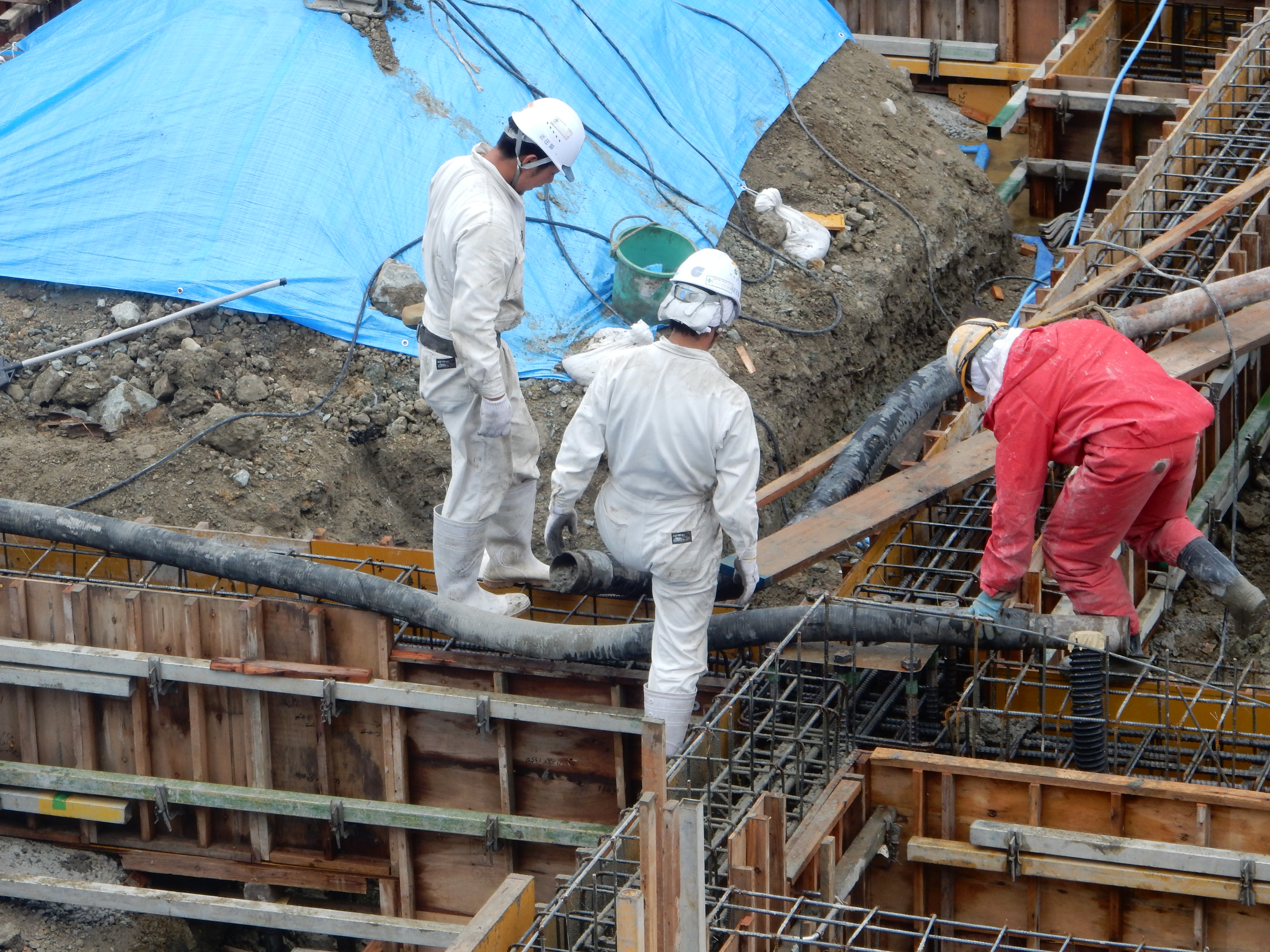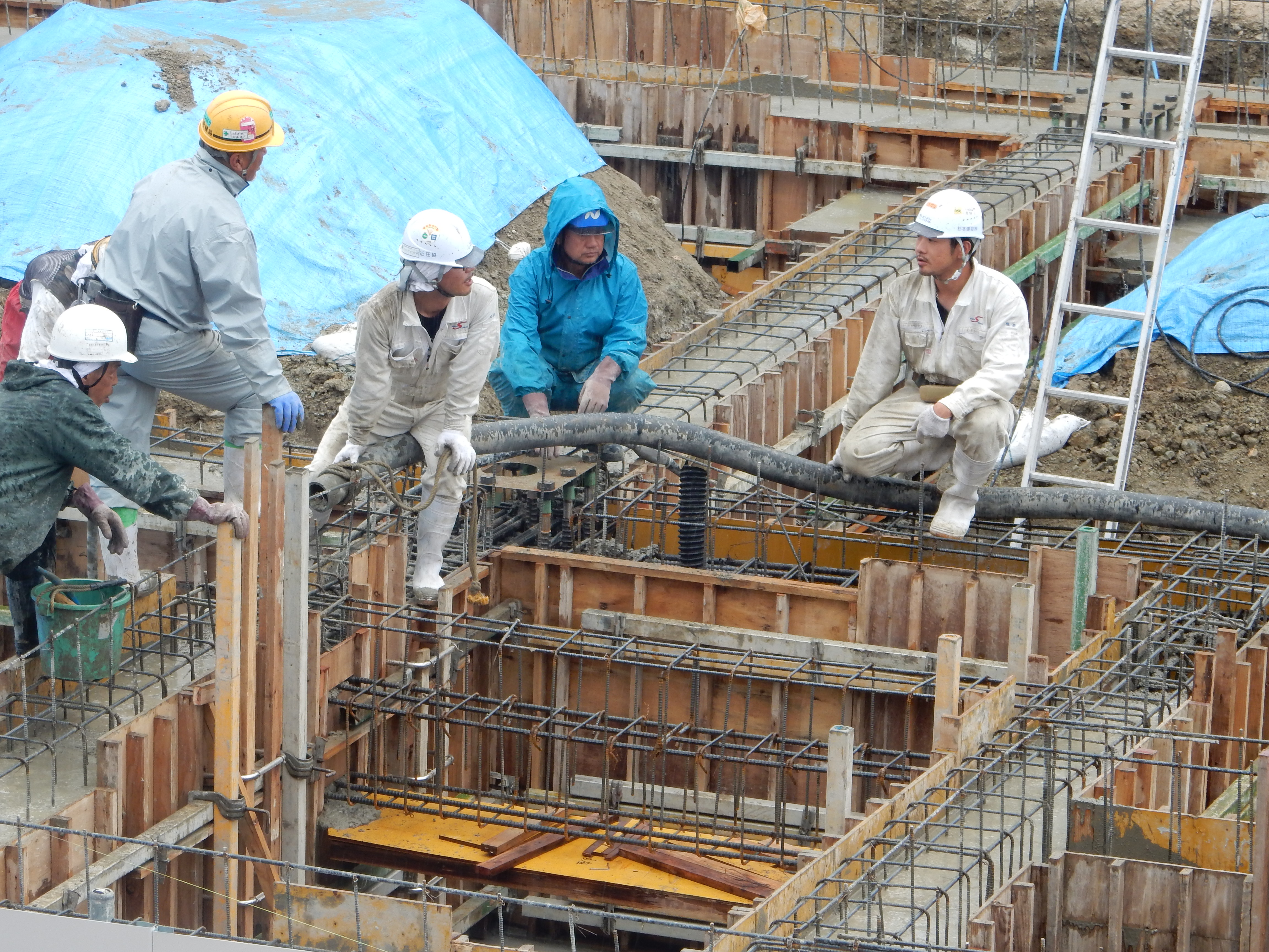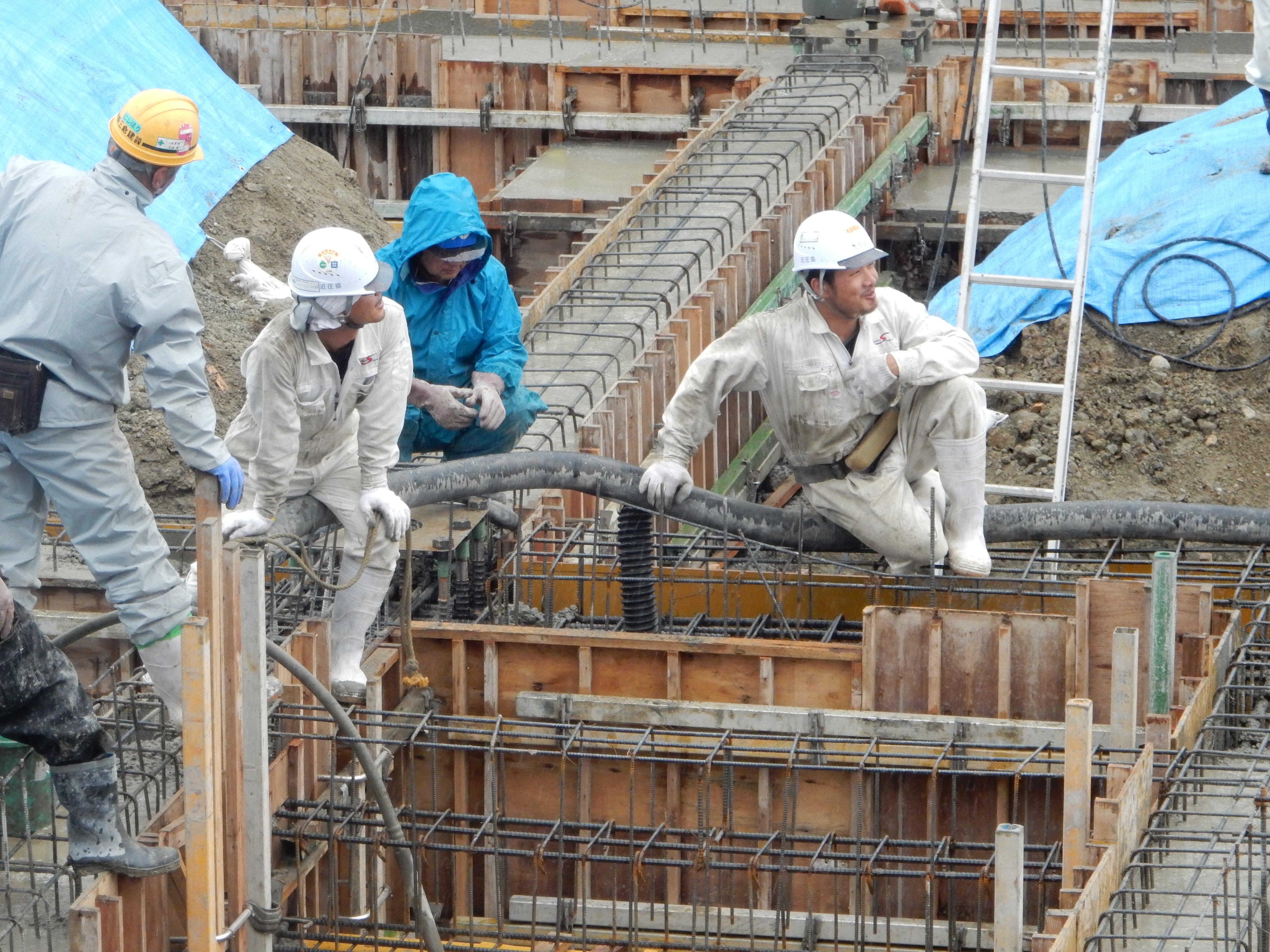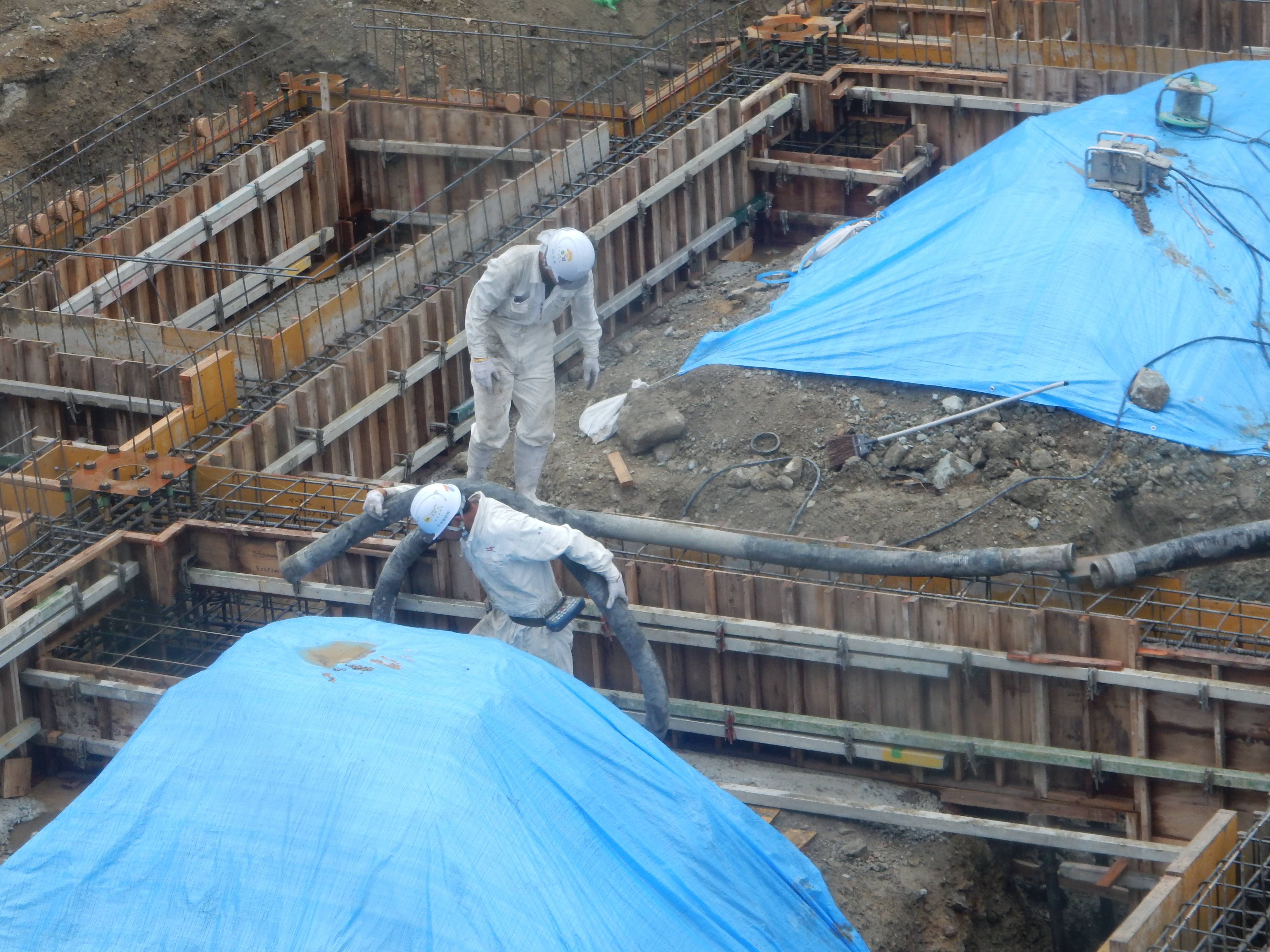 足場不足でかなり作業しにくいですが二人で協力しながら打設してます!