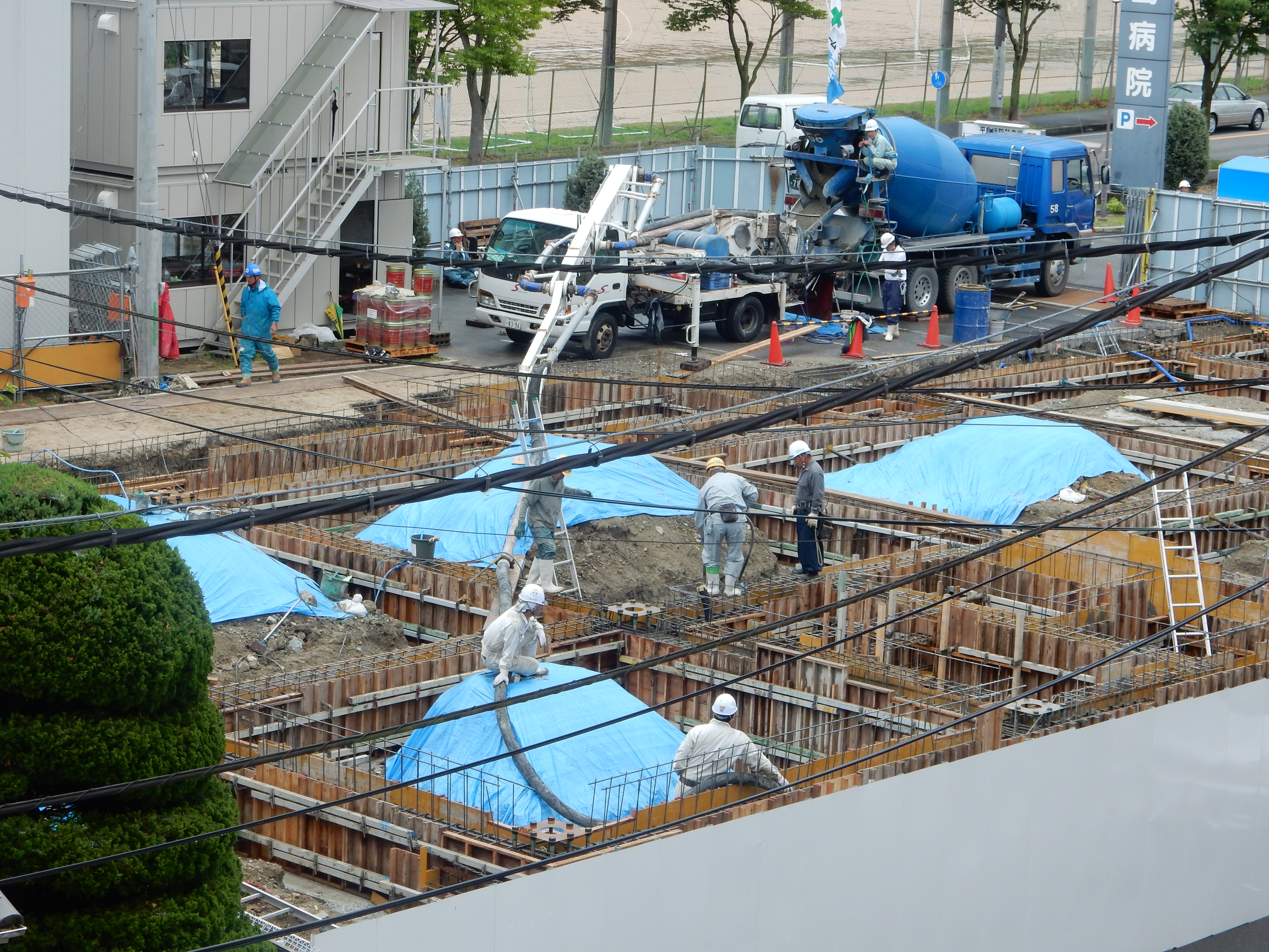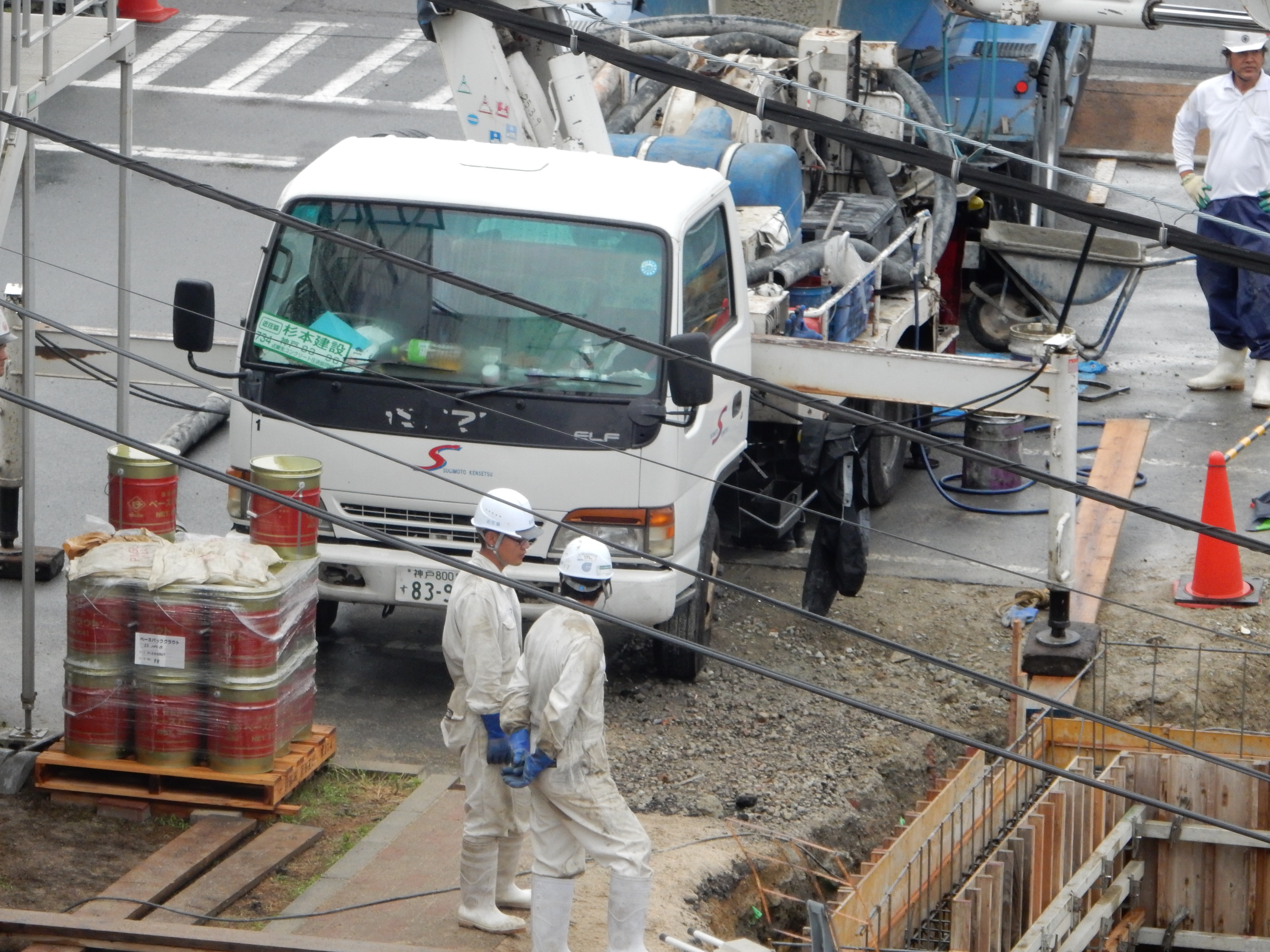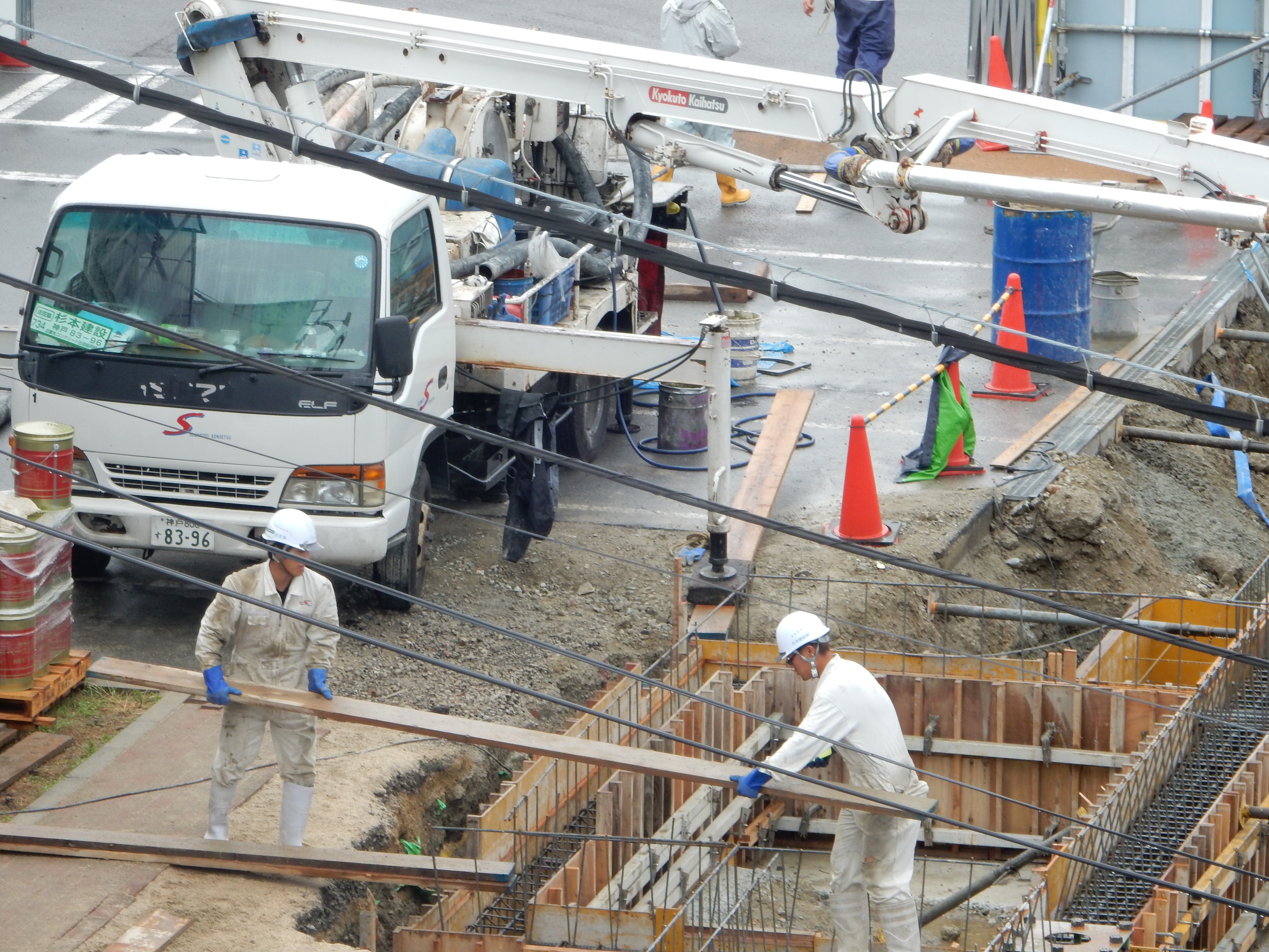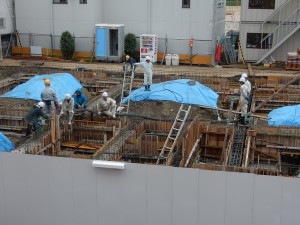 足場不足でかなり作業しにくいですが二人で協力しながら打設してます!