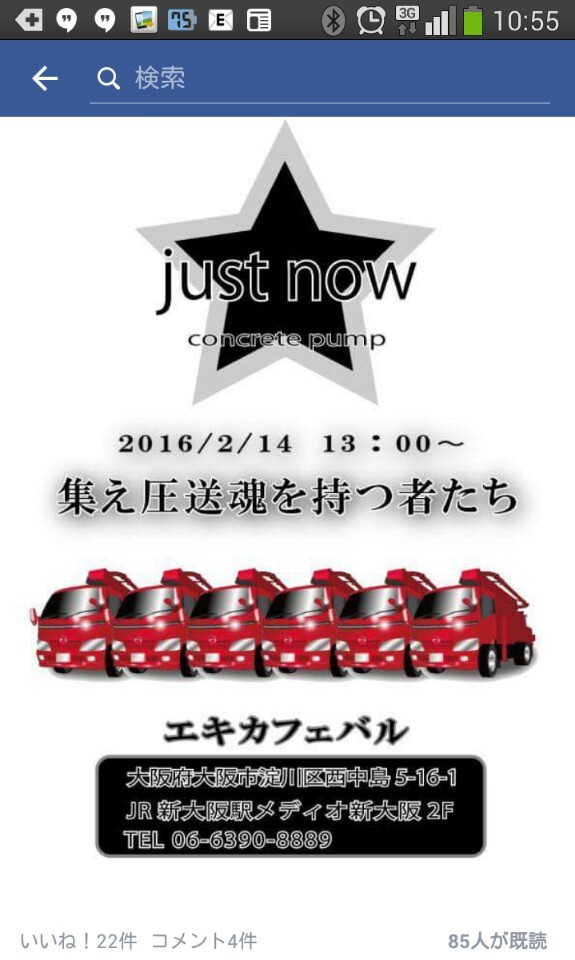 はじめてのオフ会 in新大阪 2016.02.15 こんにちは、杉本です! 先日(2/14)にはじめてのオフ会というものに参加しました! ポンプ圧送のコミニュティのサイト(フェイスブック)があり南は沖縄? 北は北海道の方とネットを通じて情報交換をしています! 今回の参加者は、西は兵庫県姫路市~東は東京・神奈川県~ 南は、大阪の河内長野~北は京都の久美浜からと総勢20名の参加でした! 同業者の方で興味ある方は、ご連絡ください~(^^)